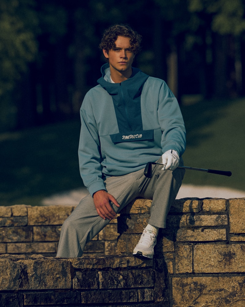 ダンボール素材とリップストップの異素材ミックスがレトロなプルオーバー。ワイドシルエットでゆったりとカジュアルな着こなしに。PUMA GOLFロゴとエンボスCATがアクセントの、こだわりのデザインです。