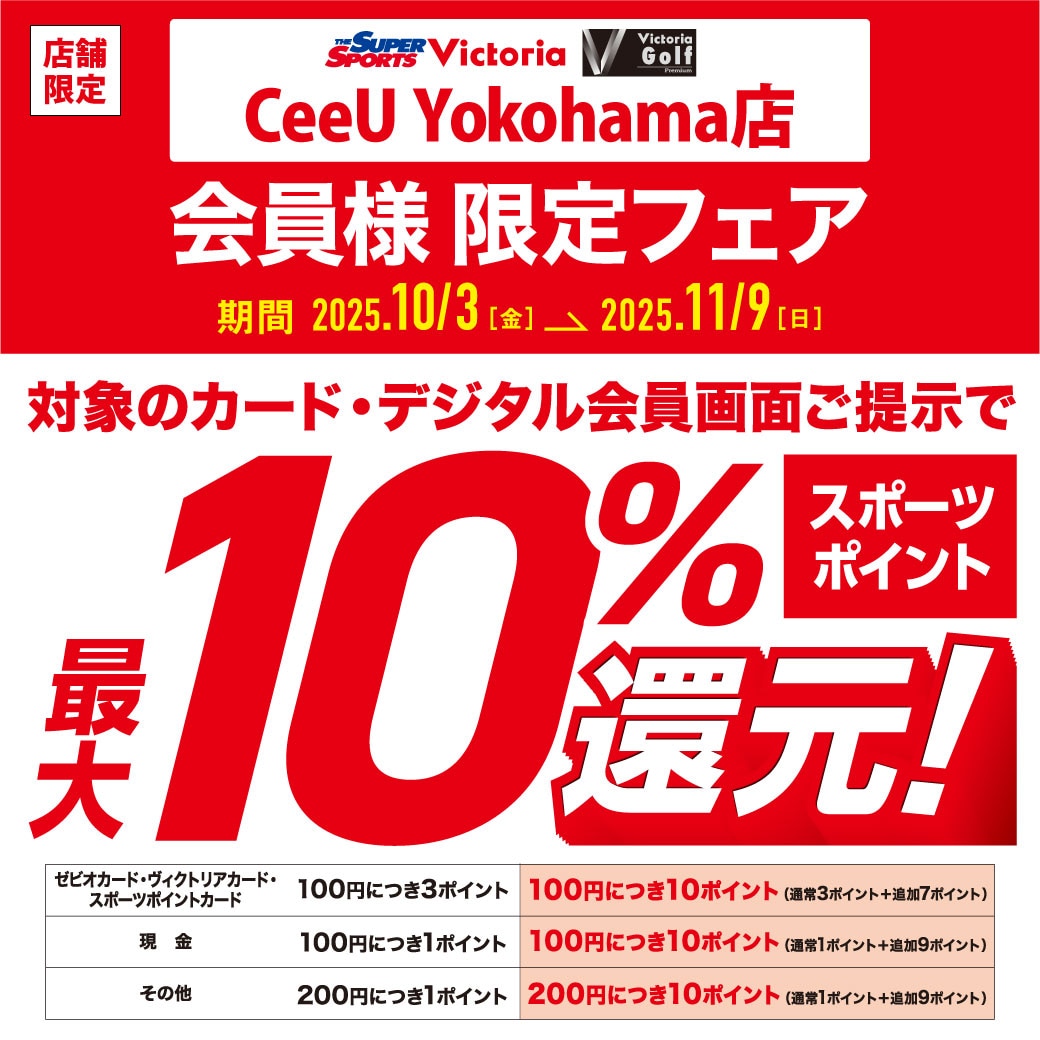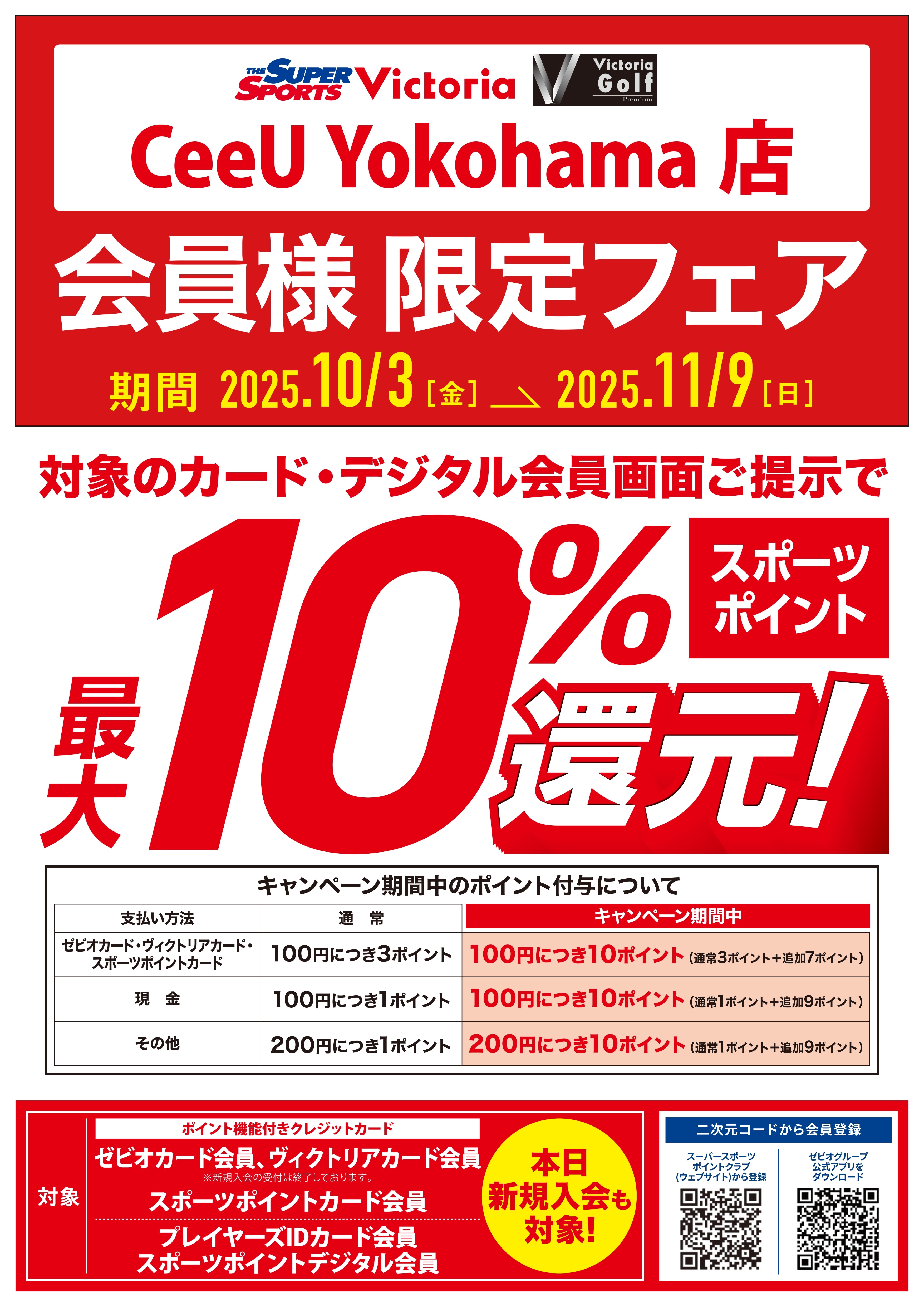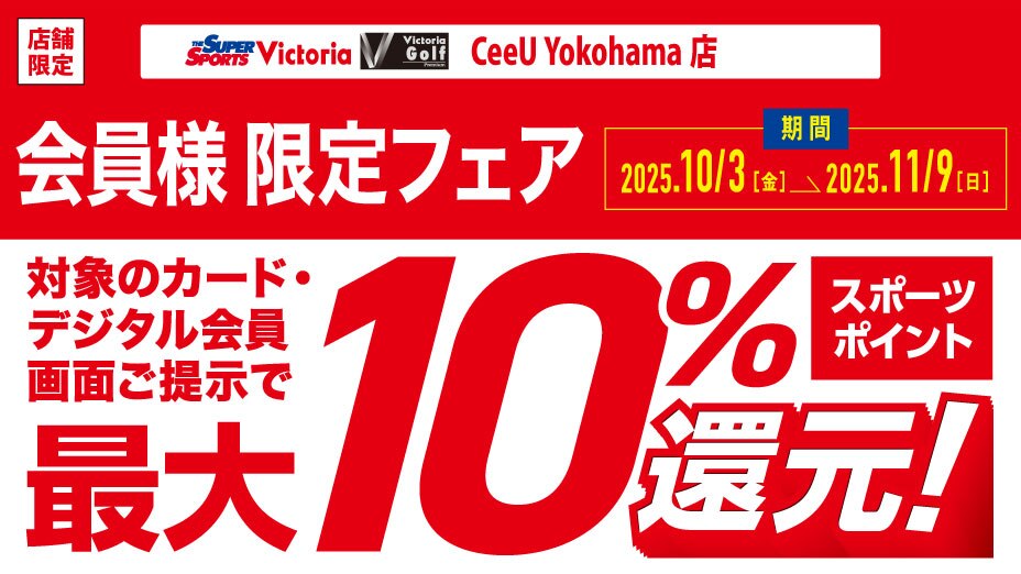 10月3日(金)~11月9日(日)まで の期間中、CeeU Yokohama店限定で 店内商品全品 スポーツポイント最大10%還元 させていただきます。 ■対象店舗 スーパースポーツヴィクトリア CeeU Yokohama店 ヴィクトリアゴルフ CEEU YOKOHAMA店 ※一部対象外商品がございます ※オンラインストアは対象外となります スポーツポイントカード・ヴィクトリアカード・ ゼビオカード・スポーツポイント会員様 限定の施策となります。 当日入会もOK。無料でご登録いただけます。 詳しくは店舗ナビゲーターまで お問合せください。
