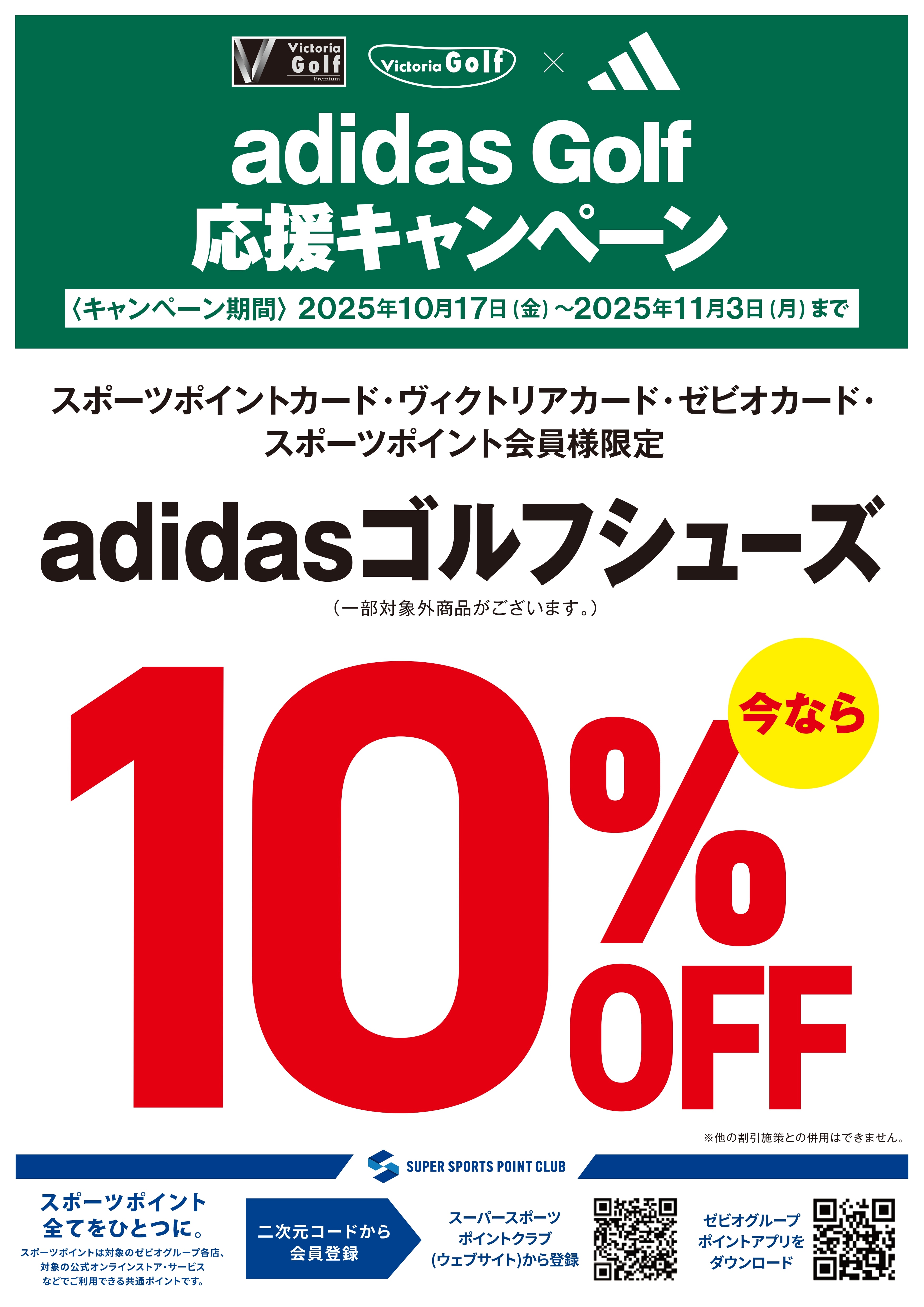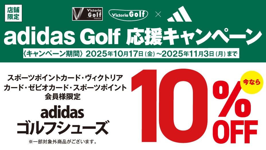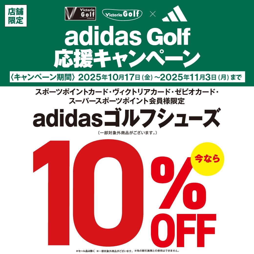10月17日(金)~11月3日(月・祝)までの 期間中、アディダスゴルフシューズ ご購入でレジにて10%OFF させていただきます。 SALE品も対象! ※一部対象外商品がございます ※オンラインストアは対象外となります スポーツポイントカード・ヴィクトリアカード・ ゼビオカード・スポーツポイント会員様 限定の施策となります。 当日入会もOK。無料でご登録いただけます。 詳しくは店舗ナビゲーターまで お問合せください。