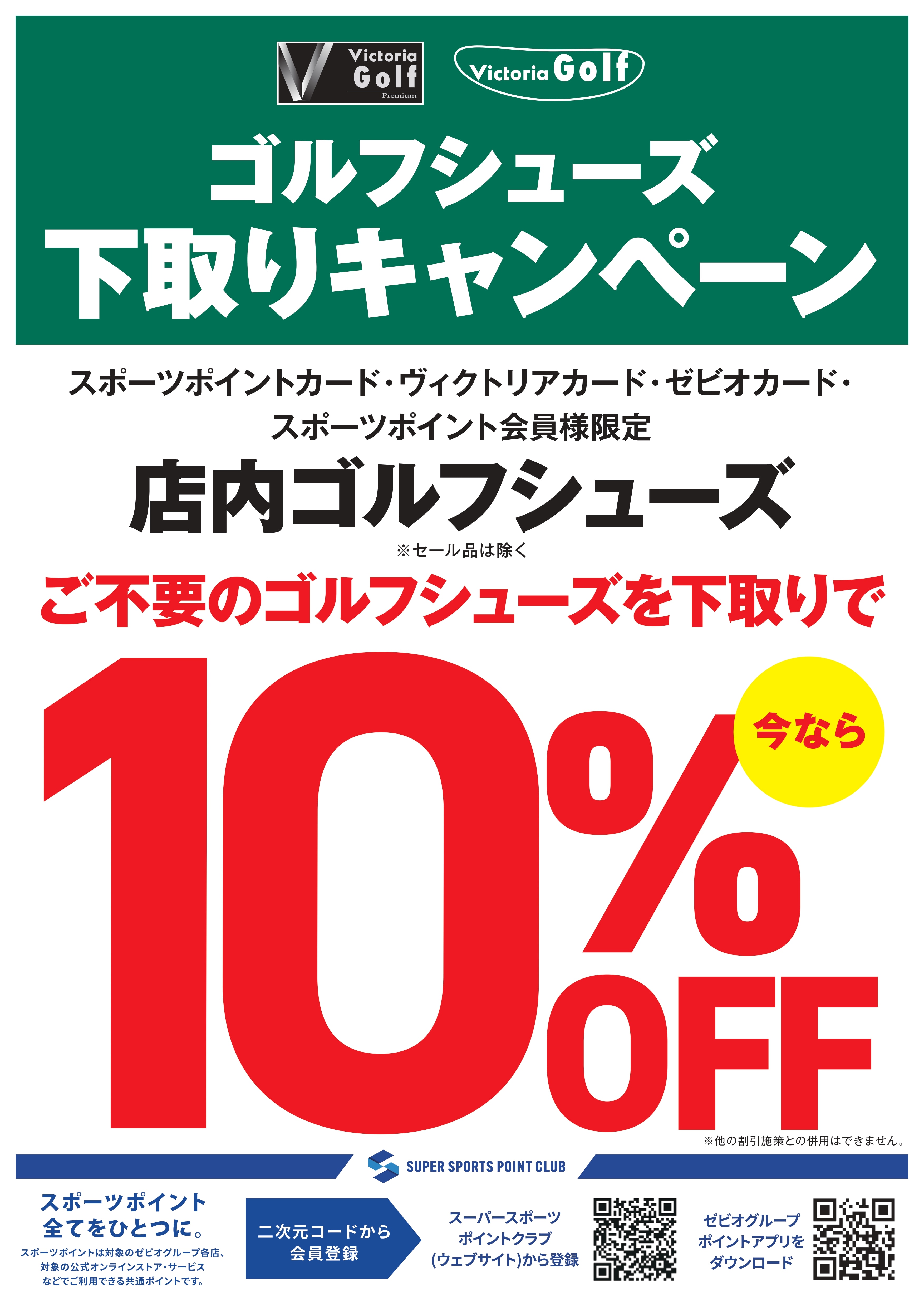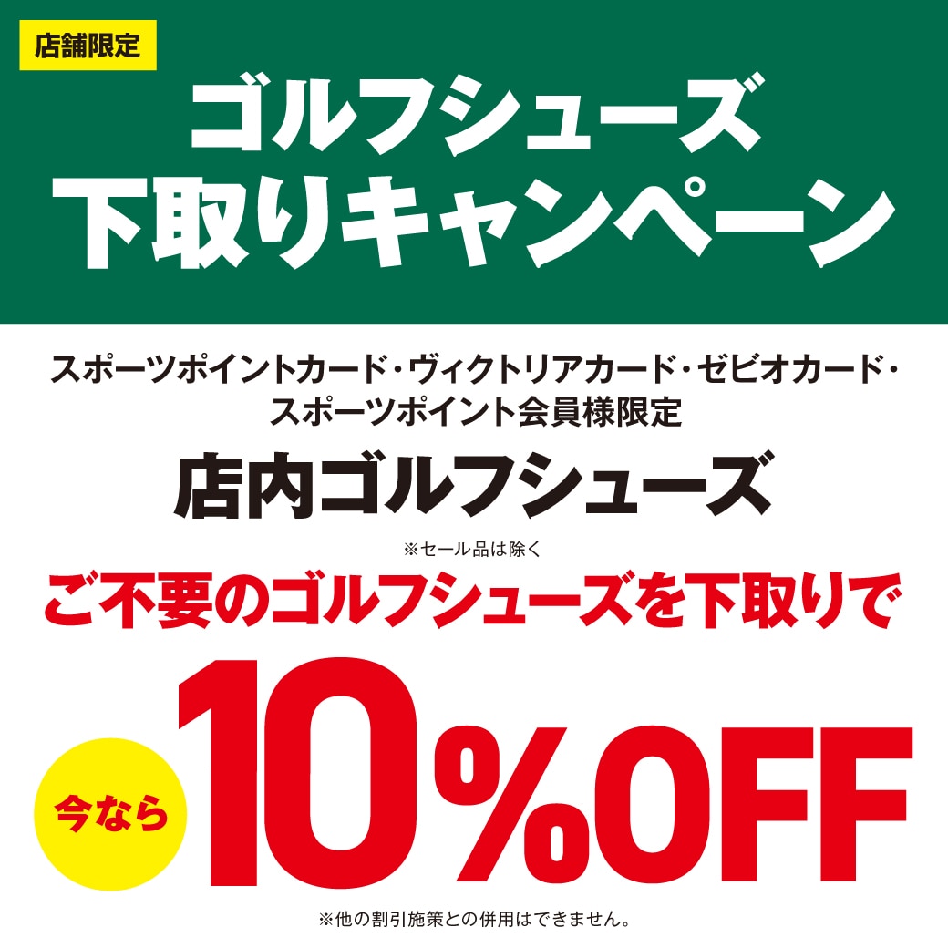 ご不要なゴルフシューズを下取りで、 ゴルフシューズをレジにて10%OFF させていただきます。 ※SALE品は対象外となります ※オンラインストアは対象外となります スポーツポイントカード・ヴィクトリアカード・ ゼビオカード・スポーツポイント会員様 限定の施策となります。 当日入会もOK。無料でご登録いただけます。 詳しくは店舗ナビゲーターまで お問合せください。