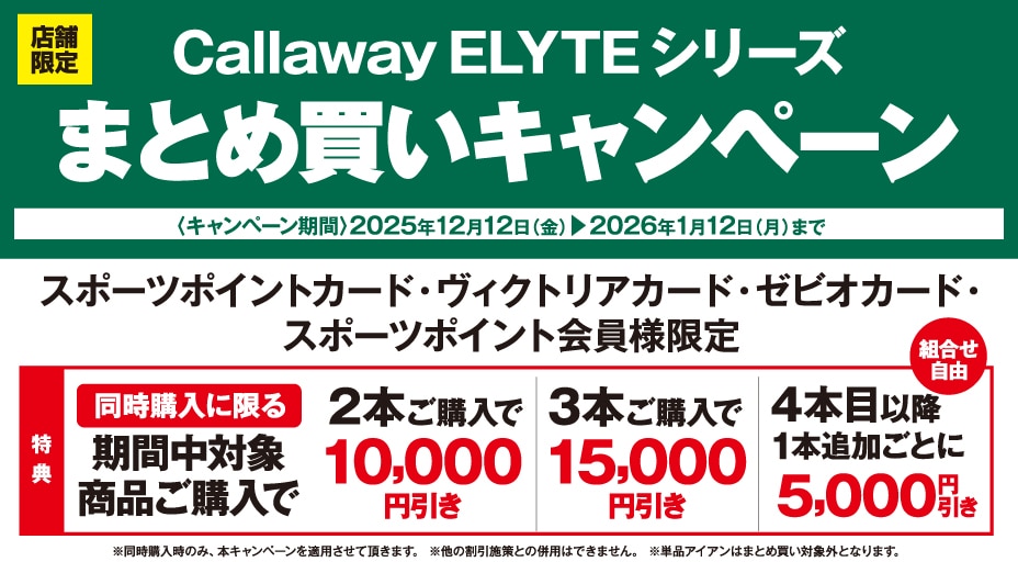 12月12日(金)~1月12日(月)まで、 キャロウェイ「エリートシリーズ」 をまとめてご購入いただくと 同時購入点数により レジにて割引させていただきます。 2本ご購入で10,000円引き 3本目以降1本追加ごとに5,000円引き ※組み合わせ自由です! ※単品アイアンはまとめ買い対象外となります。 ※オンラインストアは対象外となります スポーツポイントカード・ヴィクトリアカード・ ゼビオカード・スポーツポイント会員様 限定の施策となります。 当日入会もOK。無料でご登録いただけます。 詳しくは店舗ナビゲーターまで お問合せください。