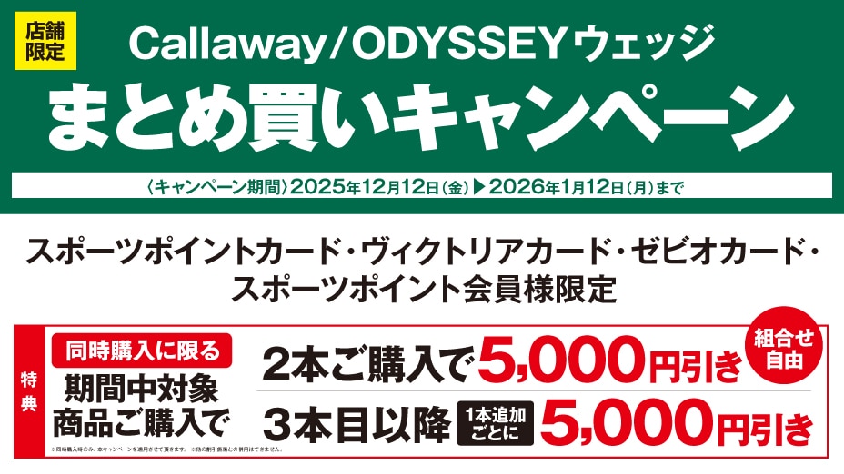 12月12日(金)~1月12日(月)まで、 キャロウェイ・オデッセイ ウェッジ をまとめてご購入いただくと 同時購入点数により レジにて割引させていただきます。 2本ご購入で5,000円引き 3本目以降以降1本追加ごとに5,000円引き ※組み合わせ自由です! ※オンラインストアは対象外となります スポーツポイントカード・ヴィクトリアカード・ ゼビオカード・スポーツポイント会員様 限定の施策となります。 当日入会もOK。無料でご登録いただけます。 詳しくは店舗ナビゲーターまで お問合せください。