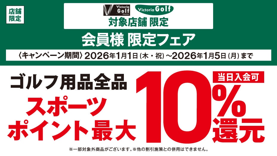 1月1日(木)~1月5日(月)まで の期間中、対象店舗限定で ゴルフ用品全品 スポーツポイント最大10%還元 させていただきます。 ■ポイント還元詳細 ・カードお支払いでで100円につき10ポイント還元 ・現金お支払いで100円につき10ポイント還元 ・その他の支払いで200円につき20ポイント還元 ※スポーツポイントカード、ゼビオカード、ヴィクトリアカード、スポーツポイントデジタル会員画面のご提示が必要です。 ※オンラインストアは対象外となります 当日入会もOK。無料でご登録いただけます。 詳しくは店舗ナビゲーターまで お問合せください。