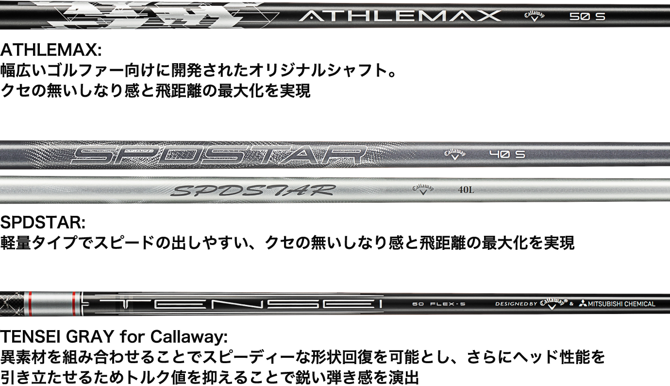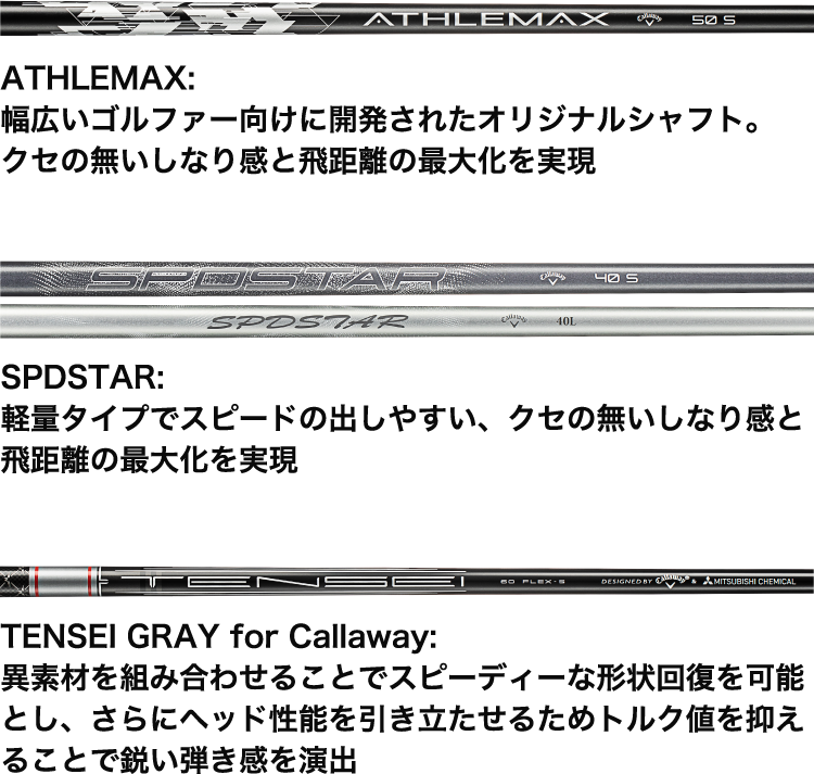 *ATHLEMAX 50, TENSEI GRAY 60 for Callawayは、シャフトカット前の値になります。