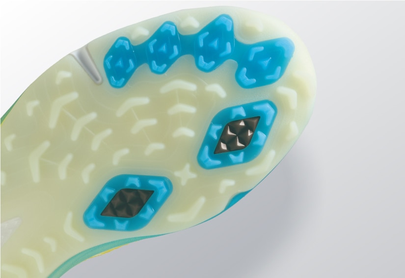 計算されたトラクションの配置により、スイング中の体重意識に芝をしっかり捉え、ブレを抑制。