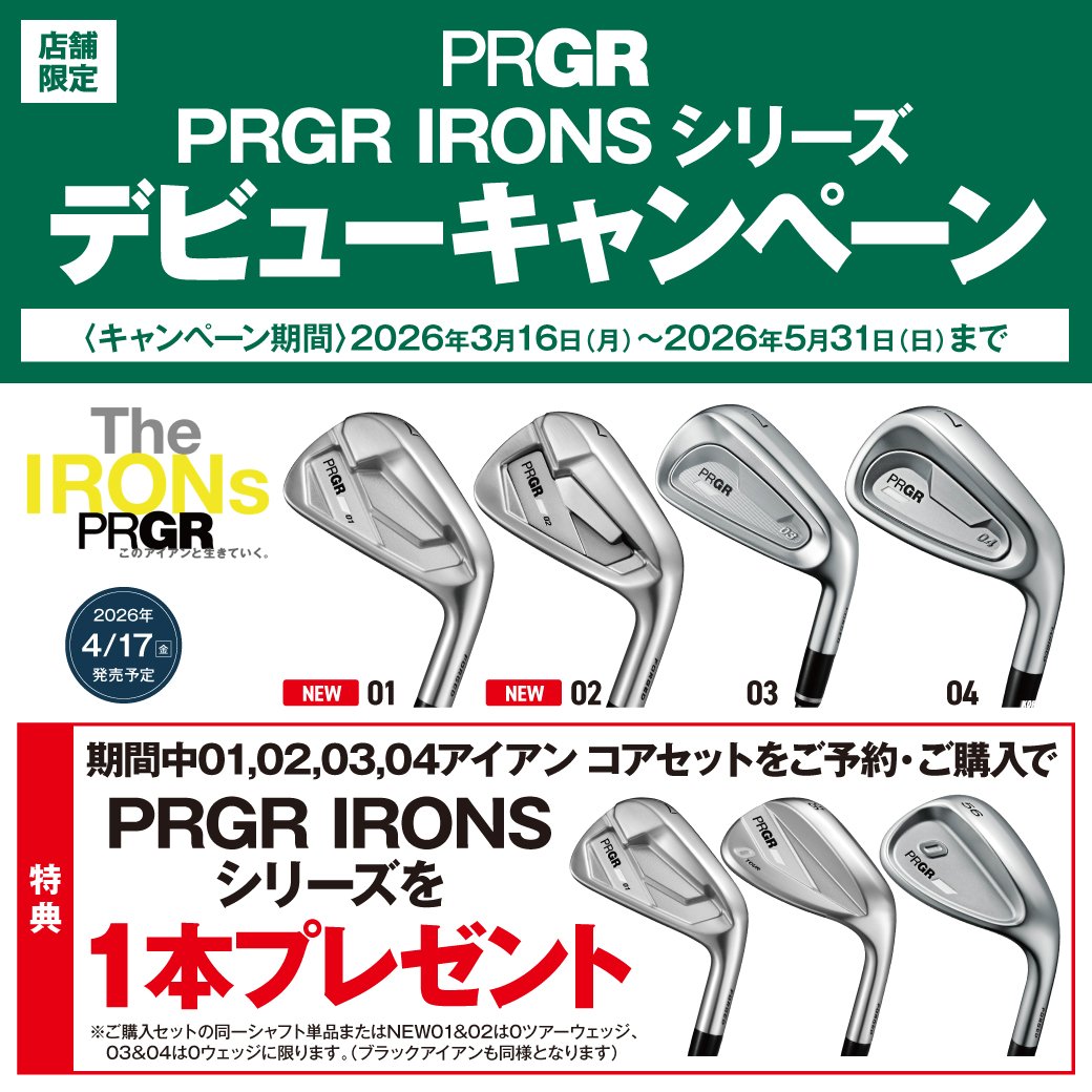PRGR IRONSシリーズが、4/17(金)発売! 発売を記念して期間中、 IRONsシリーズのアイアン コアセット をご予約、ご購入で PRGR IRONSシリーズを1本プレゼント ■対象商品 ・IRONSシリーズ 01,02,03,04アイアン コアセット ※ご購入セットの同一シャフト単品 またはNEW01&02は0ツアーウェッジ、 03&04は0ウェッジに限ります。 (ブラックアイアンも同様となります) ※カスタム注文も対象です。 ※ノーメッキウェッジ(限定品) は対象外です。 詳しくは店舗ナビゲーターまで お問い合わせください。 ※オンラインストアは対象外となります。 詳しくは店舗ナビゲーターまで お問合せください。