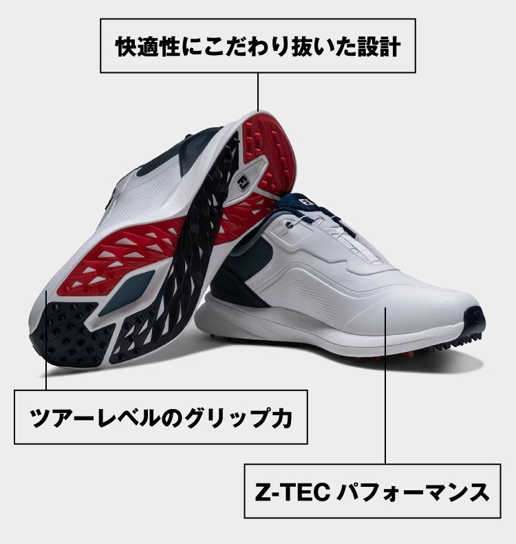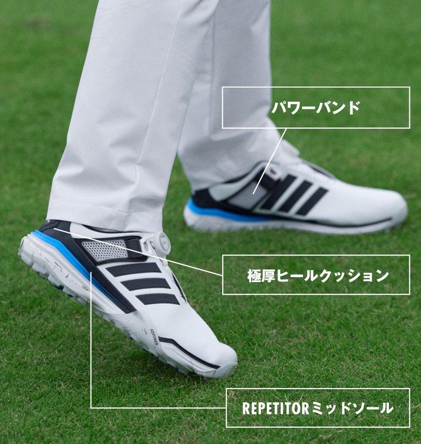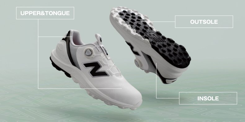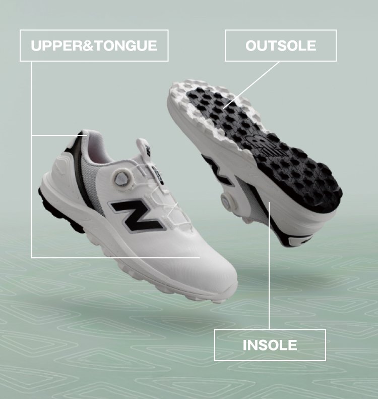 3Dシャンクが捻れを抑え安定性を確保し、スイング分析に基づいたアウトソールが高い安定性とグリップ力を発揮。
