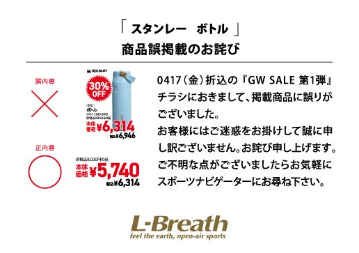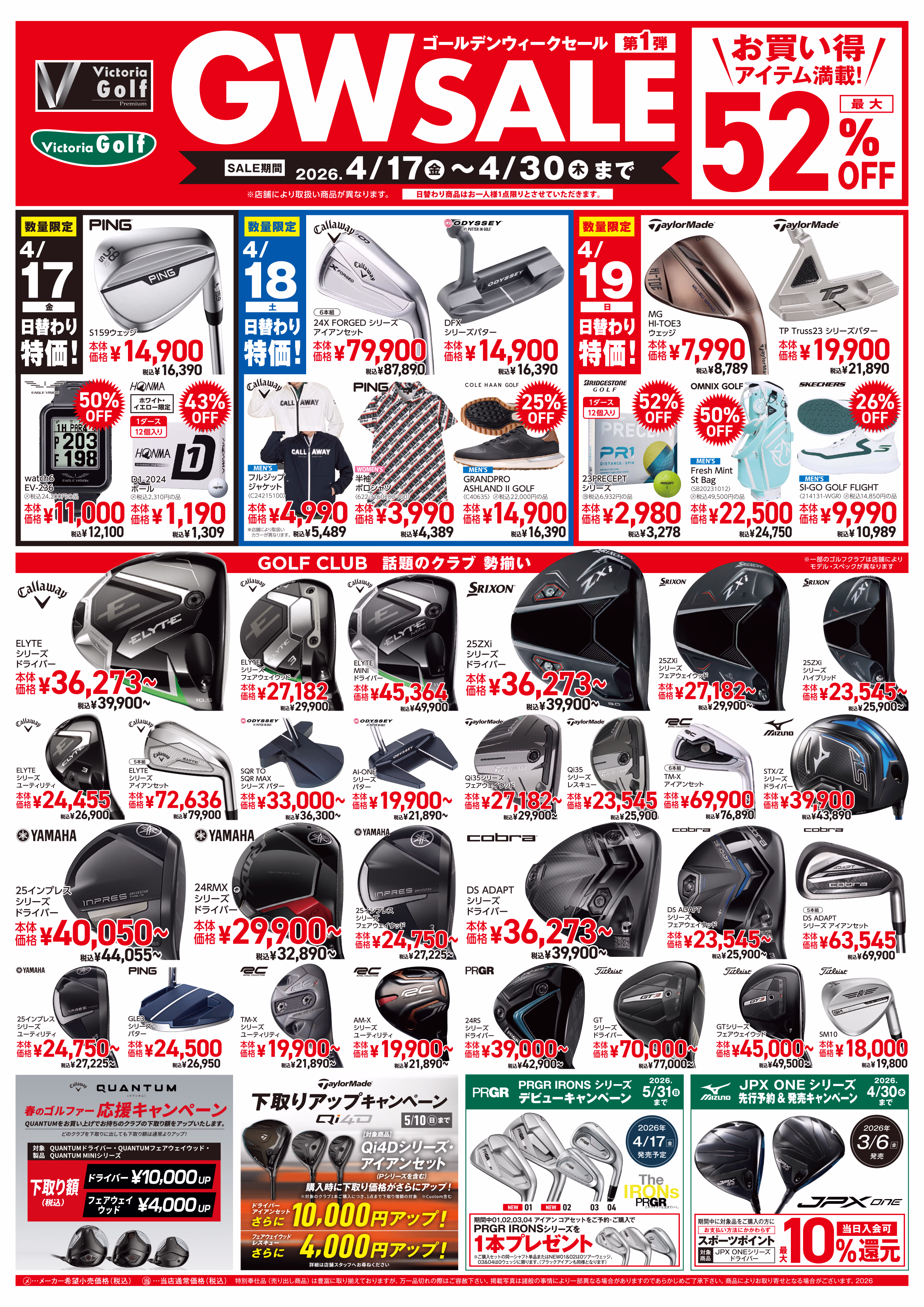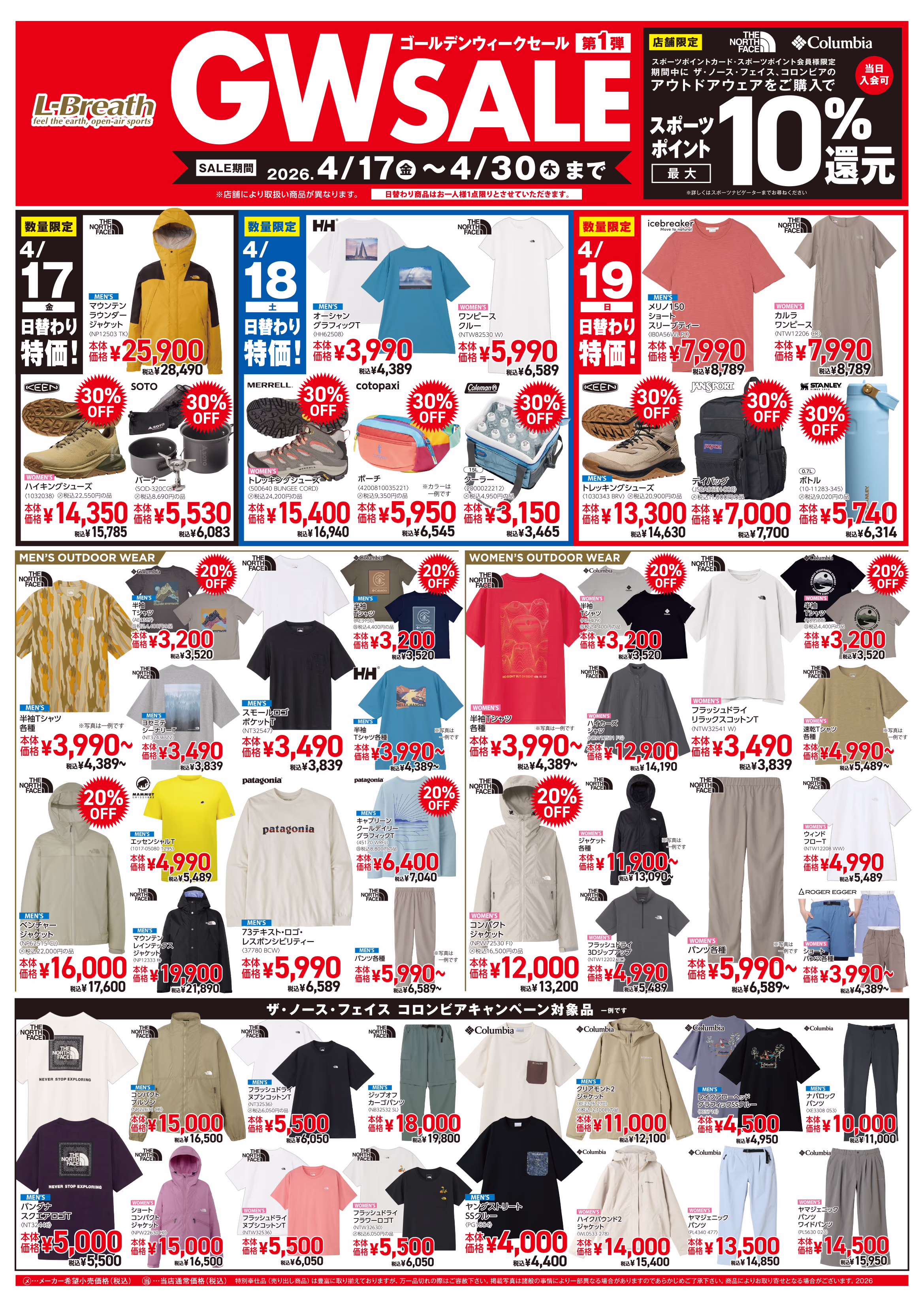 4月17日(金)~5月11日(月)まで 【GW SALE】がスタートいたします! 4月30日(木)までは、第1弾! 店内商品が驚きの決算特価で勢揃いいたします。 ※オンラインストアは対象外です。 ※店舗によって取扱商品は異なります。 ※詳しい取扱商品に関しては店舗まで お問い合わせください。