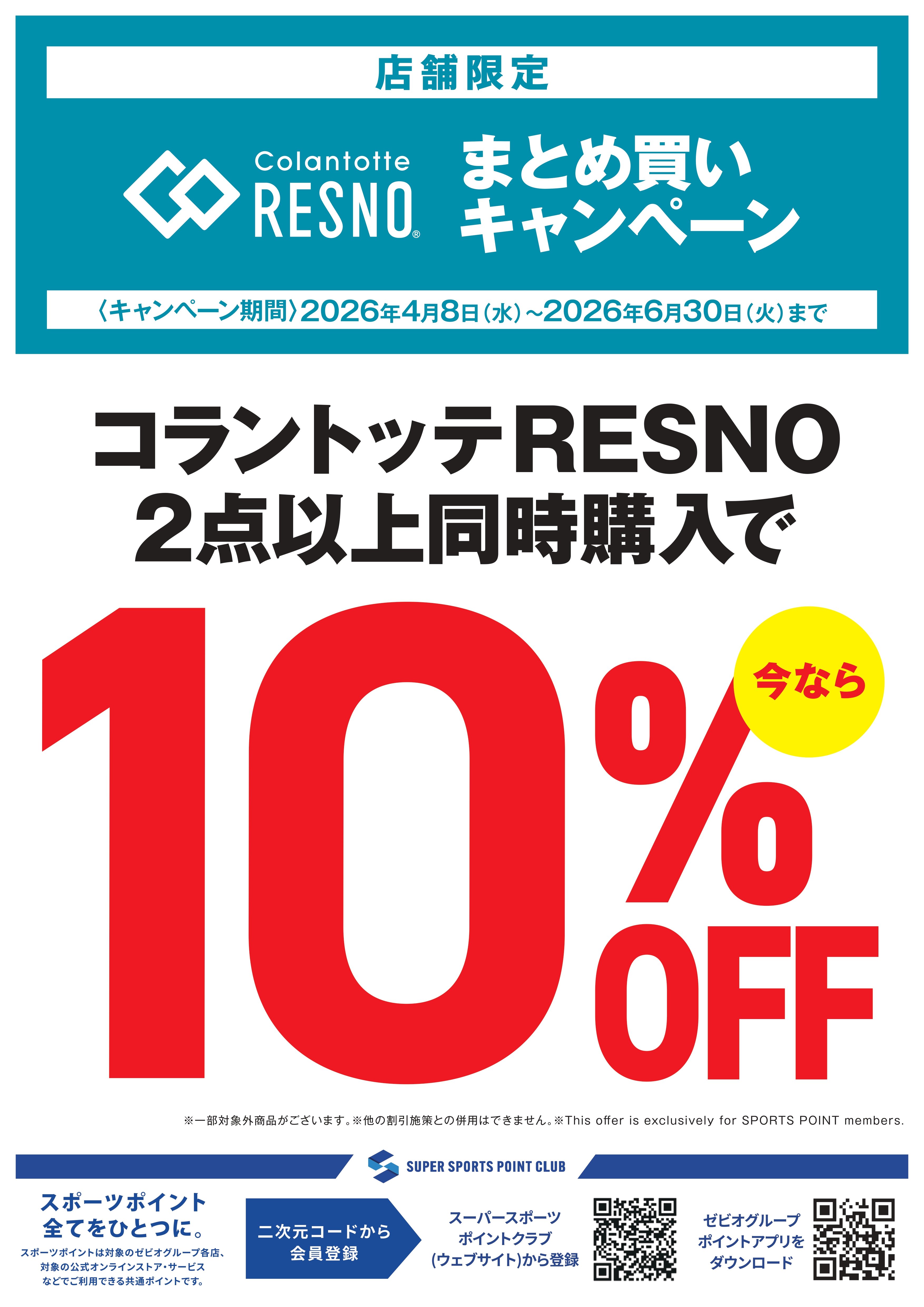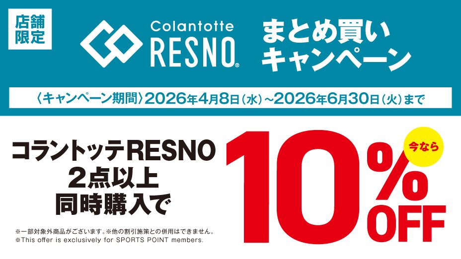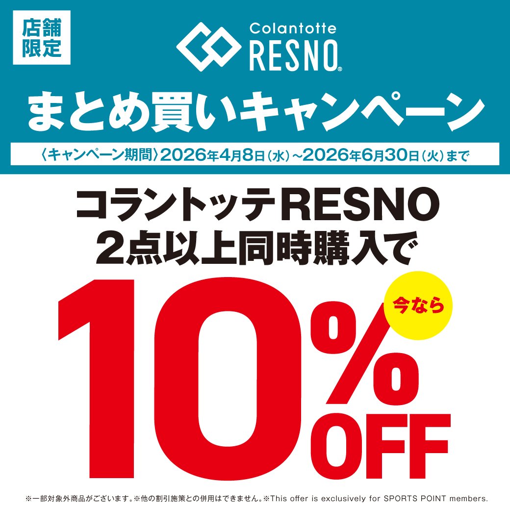 4月8日(水)~6月30日(火)まで の期間中、対象店舗限定で コラントッテRESNO商品を 2点以上ご購入で10%OFF させていただきます。 ※一部対象外商品がございます ※オンラインストアは対象外となります スポーツポイントカード・スポーツポイント会員様 限定の施策となります。 当日入会もOK。無料でご登録いただけます。 詳しくは店舗ナビゲーターまで お問合せください。