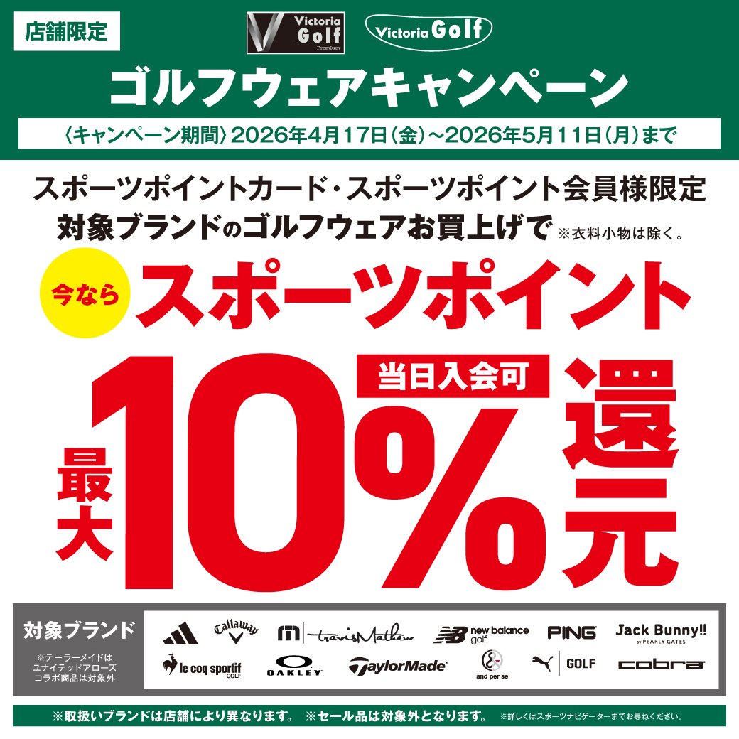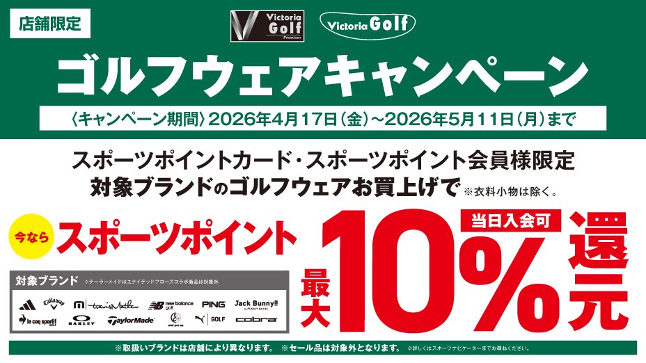 4月17日(金)~5月11日(月)までの 期間中、対象ブランドゴルフウェアを ご購入でスポーツポイント最大10%還元 させていただきます。 ■ポイント還元詳細 ・カード支払いで100円につき10ポイント還元 ・現金支払いで100円につき10ポイント還元 ・その他の支払いで200円につき20ポイント還元 スポーツポイントカード・ スポーツポイント会員様限定キャンペーン となります。 ※会員画面のご提示が必要です。 当日入会もOK。無料でご登録いただけます。 詳しくは店舗ナビゲーターまで お問合せください。