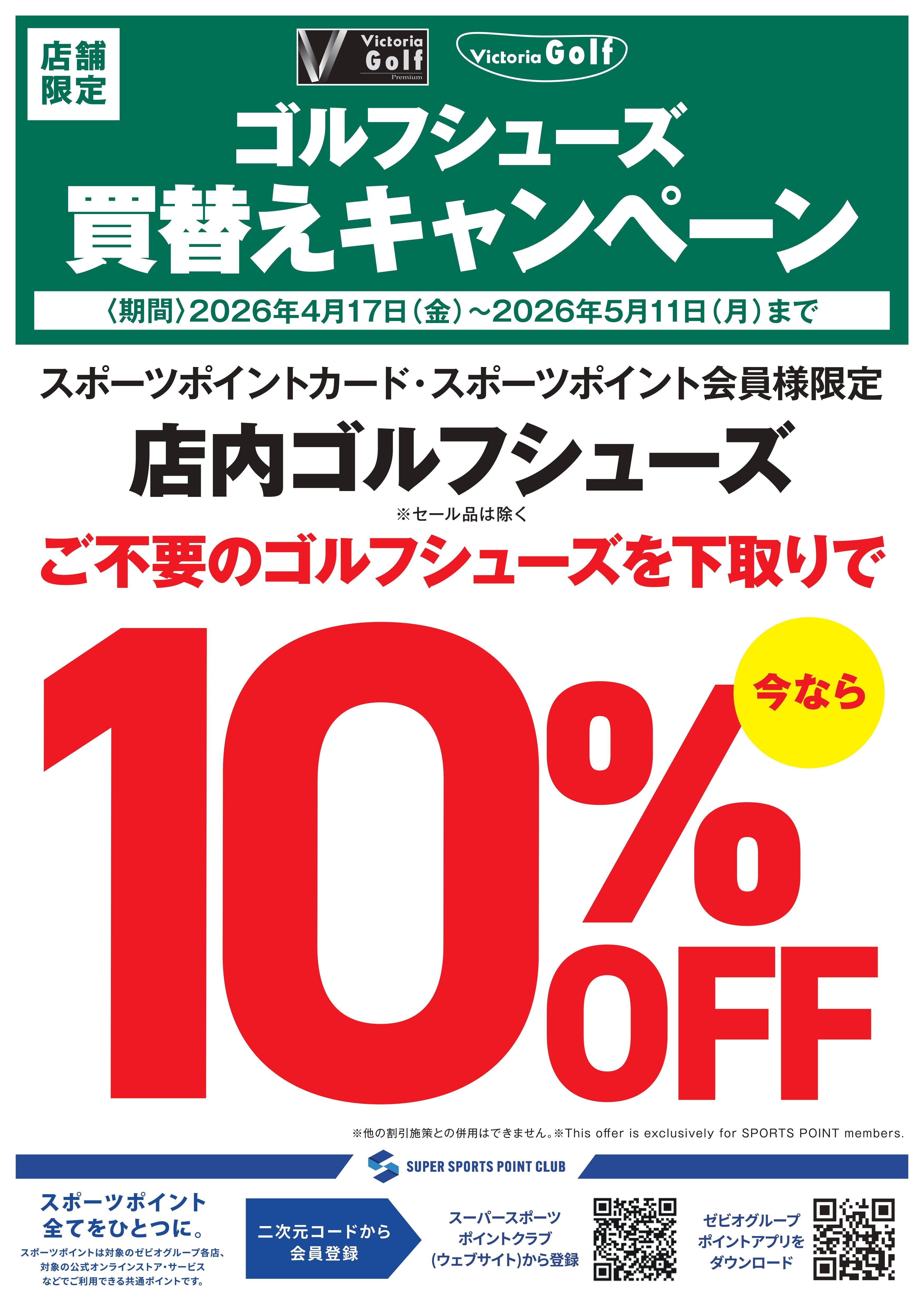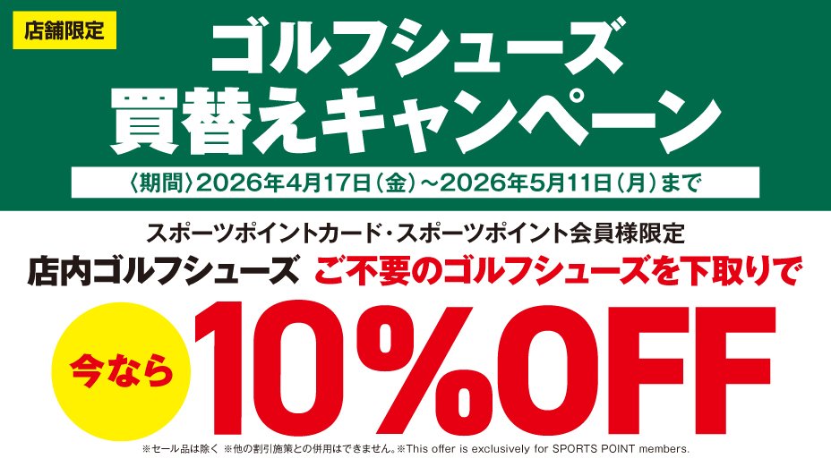 4月17日(金)~5月11日(月)まで、 ご不要のゴルフシューズを下取りで 店内ゴルフシューズ レジにて10%OFF させていただきます。 ※セール品は対象外になります。 ※一部対象外商品がございます ※オンラインストアは対象外となります スポーツポイントカード・ スポーツポイント会員様限定キャンペーン となります。 ※会員画面のご提示が必要です。 当日入会もOK。無料でご登録いただけます。 詳しくは店舗ナビゲーターまで お問合せください。