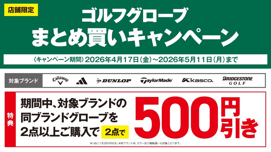 4月17日(金)~5月11日(月)までの 期間中、対象ブランドの 同一ブランドグローブ2点購入で500円割引 ※同一ブランドであれば、 カラー違いや価格違いも対象です。 ※一部対象外商品がございます ※オンラインストアは対象外となります スポーツポイントカード・ スポーツポイント会員様限定キャンペーン となります。 ※会員画面のご提示が必要です。 当日入会もOK。無料でご登録いただけます。 詳しくは店舗ナビゲーターまで お問合せください。