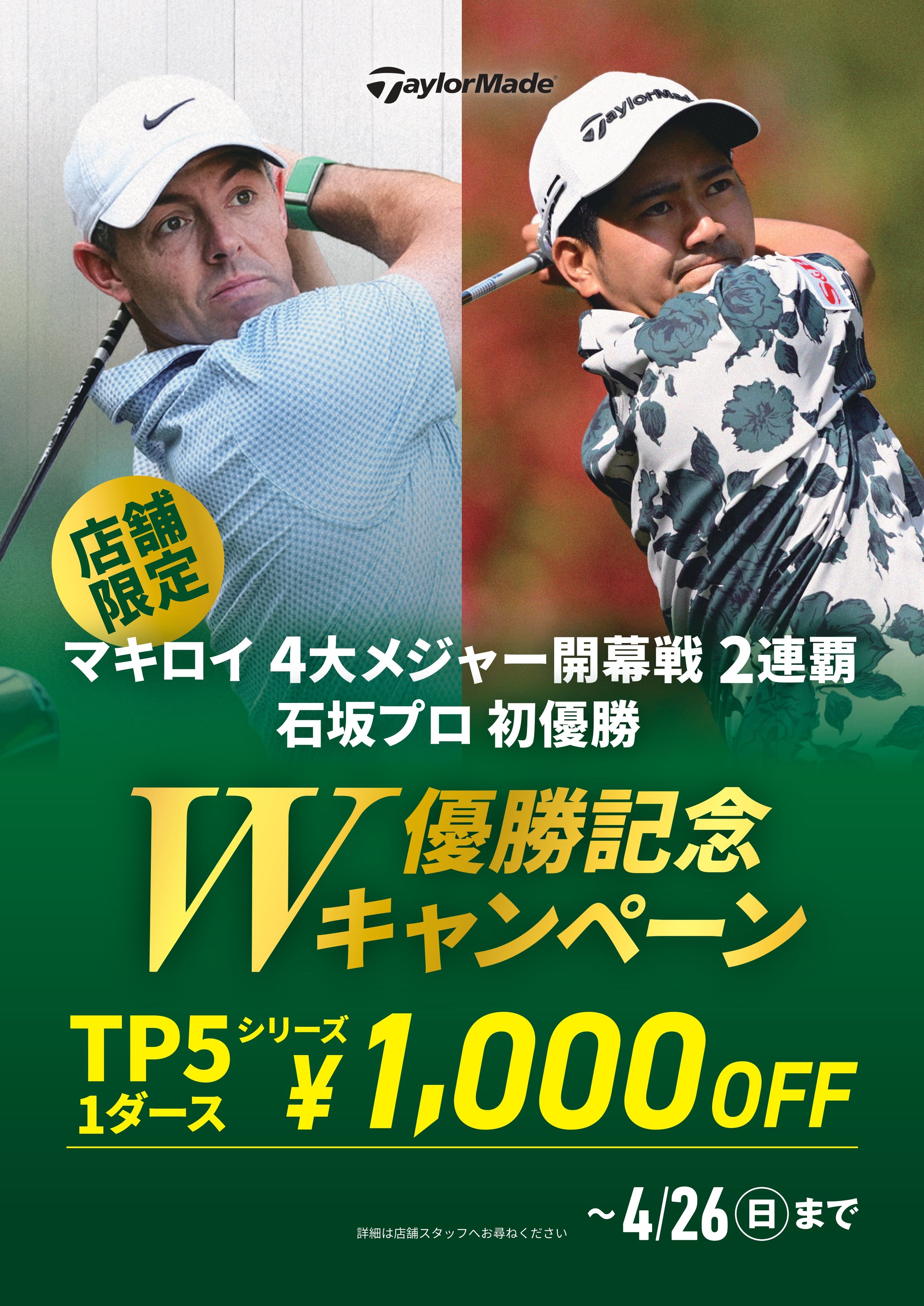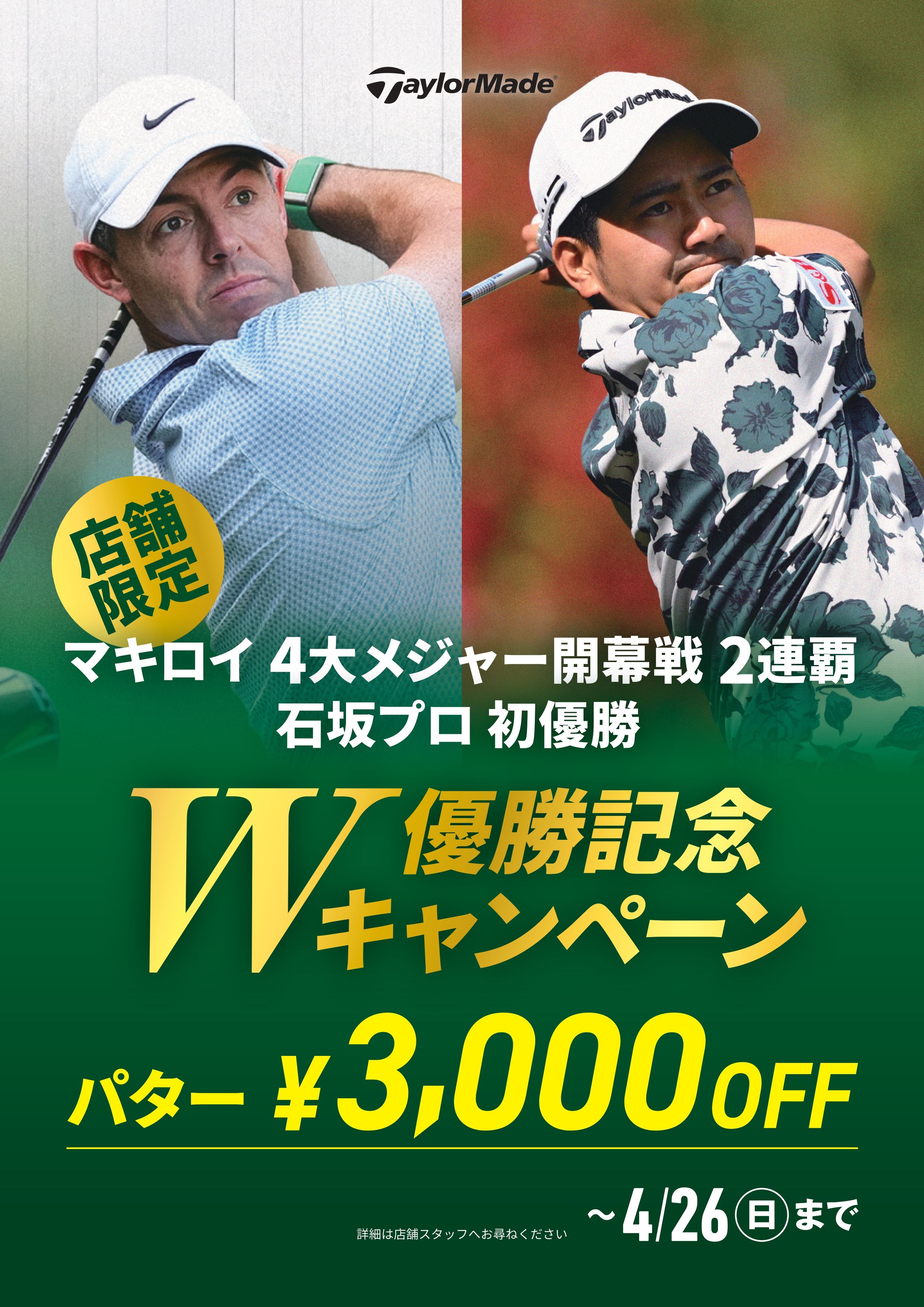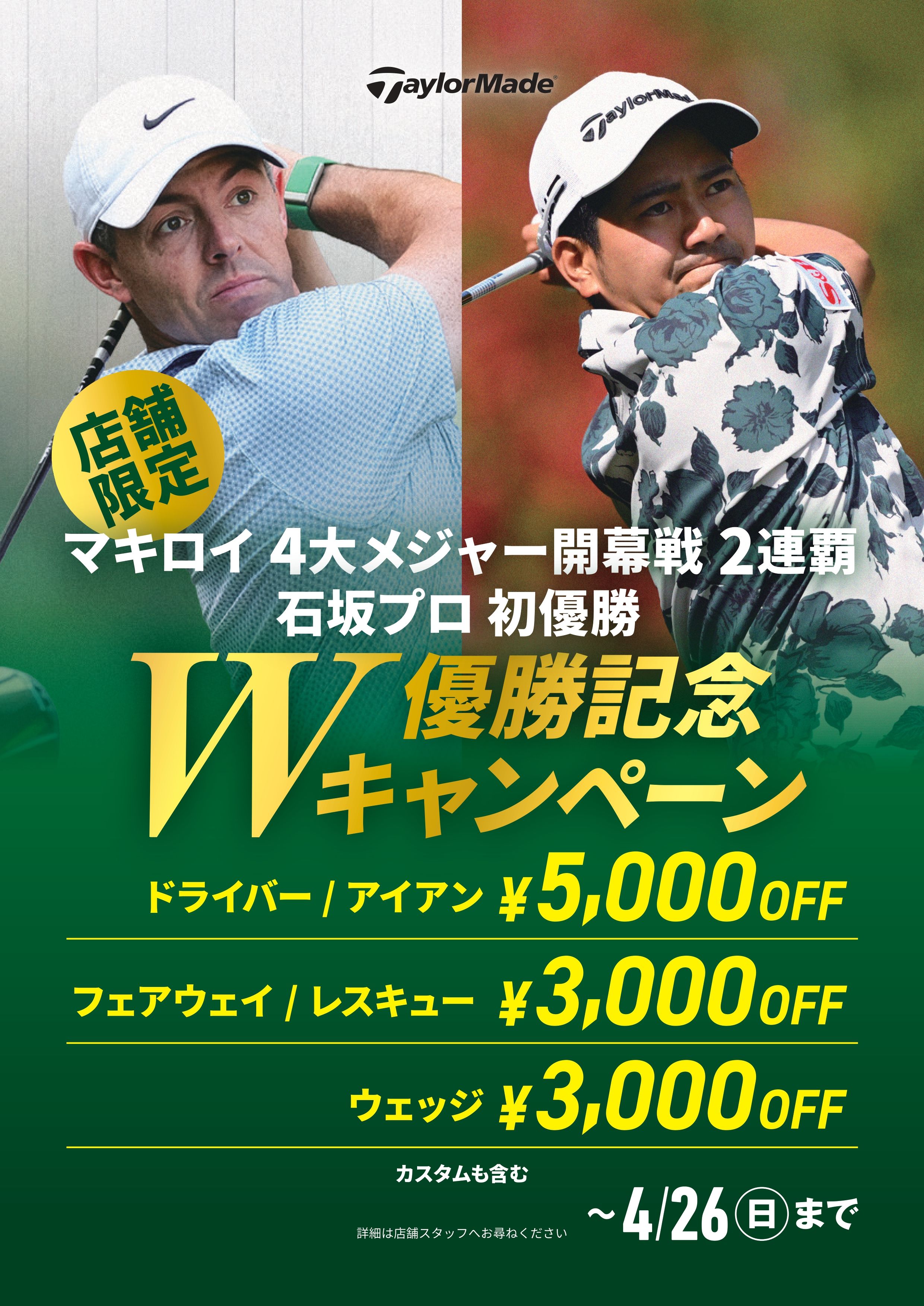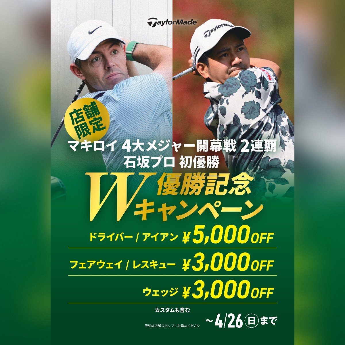 この度、テーラーメイド契約選手による 素晴らしいニュースが届きました! ローリー・マキロイ選手が 4大メジャー開幕戦にて見事2連覇を達成 。 さらに、石坂プロが待望の初優勝を飾りました 。 この輝かしいダブル受賞を記念して、 4月16日(木)~4月26日(日)まで、 日頃の感謝を込めた「W優勝記念キャンペーン」 を店舗限定で開催いたします 。 TaylorMadeの対象最新クラブ・ボールを、 レジにて特別割引いたします。 あなたにぴったりの1本を お得に手に入れる絶好のチャンスです。