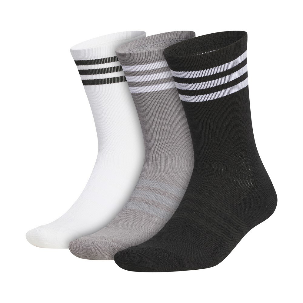 ●グリーンを踏みしめる足元も、スタイリッシュに。このクルー丈ゴルフソックスは、履き口周りにスリーストライプスをあしらい、アディダスのバッジ オブ スポーツでブランド愛を表現したデザイン。トップに配したメッシュがラウンド中ずっと足に通気性をもたらし、甲部分のコンプレッションがサポート力を発揮する。