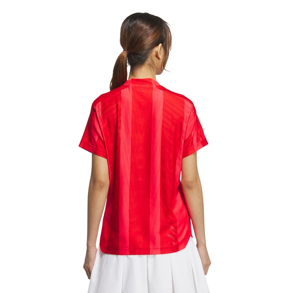 ●独特な質感のジャカードニット生地に太めの縦ストライプをあしらった、斬新なデザインのゴルフシャツ。モックネックスタイルで、吸湿性を発揮するAEROREADYテクノロジーを汗をかきやすいエリアに採用。どんなレベルのプレーにも対応するスポーツシャツ。