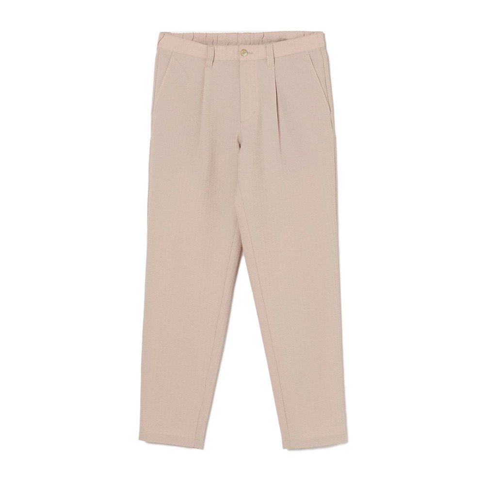 ●シアサッカーロングパンツ。夏のゴルフシーンに最適な、涼しげなシアサッカー素材を使用。進化したランダムなストライプ織が、上質な印象を与える。ポリエステル100%のため、シワになりにくく、イージーケアが魅力。吸水速乾と2Wayストレッチ機能を備え、快適な着心地を実現。肌との接点が少ないため、さらりとした感触が続く。リラックス感のあるテーパードシルエットが、スタイリッシュな印象を演出。シャツやポロシャツと合わせれば、洗練されたゴルフスタイルに。カジュアルなTシャツとスニーカーを選べば、リゾートや夏のカジュアルシーンにもぴったり。大人の遊び心を感じさせる一着。