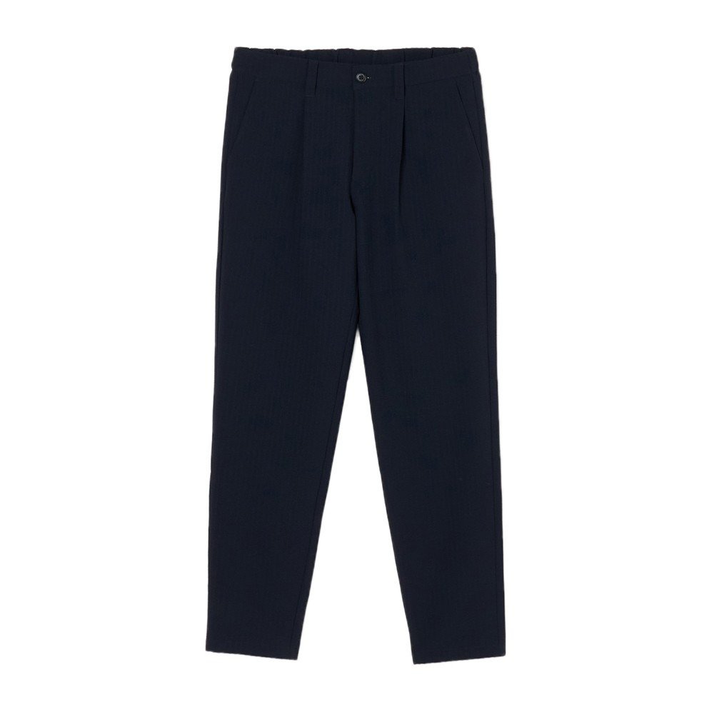 ●シアサッカーロングパンツ。夏のゴルフシーンに最適な、涼しげなシアサッカー素材を使用。進化したランダムなストライプ織が、上質な印象を与える。ポリエステル100%のため、シワになりにくく、イージーケアが魅力。吸水速乾と2Wayストレッチ機能を備え、快適な着心地を実現。肌との接点が少ないため、さらりとした感触が続く。リラックス感のあるテーパードシルエットが、スタイリッシュな印象を演出。シャツやポロシャツと合わせれば、洗練されたゴルフスタイルに。カジュアルなTシャツとスニーカーを選べば、リゾートや夏のカジュアルシーンにもぴったり。大人の遊び心を感じさせる一着。