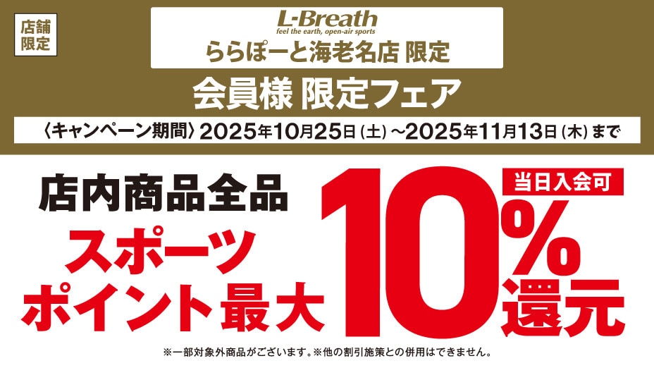 10月25日(土)~11月13日(木)まで の期間中、L-Breathららぽーと海老名店 限定で店内商品全品 スポーツポイント最大10%還元 させていただきます。 ■ポイント還元詳細 ・カードお支払いでで100円につき10ポイント還元 ・現金お支払いで100円につき10ポイント還元 ・その他の支払いで200円につき20ポイント還元 ※スポーツポイントカード、ゼビオカード、ヴィクトリアカード、スポーツポイントデジタル会員画面のご提示が必要です。 ※オンラインストアは対象外となります スポーツポイントカード・ヴィクトリアカード・ ゼビオカード・スポーツポイント会員様 限定の施策となります。 当日入会もOK。無料でご登録いただけます。 詳しくは店舗ナビゲーターまで お問合せください。