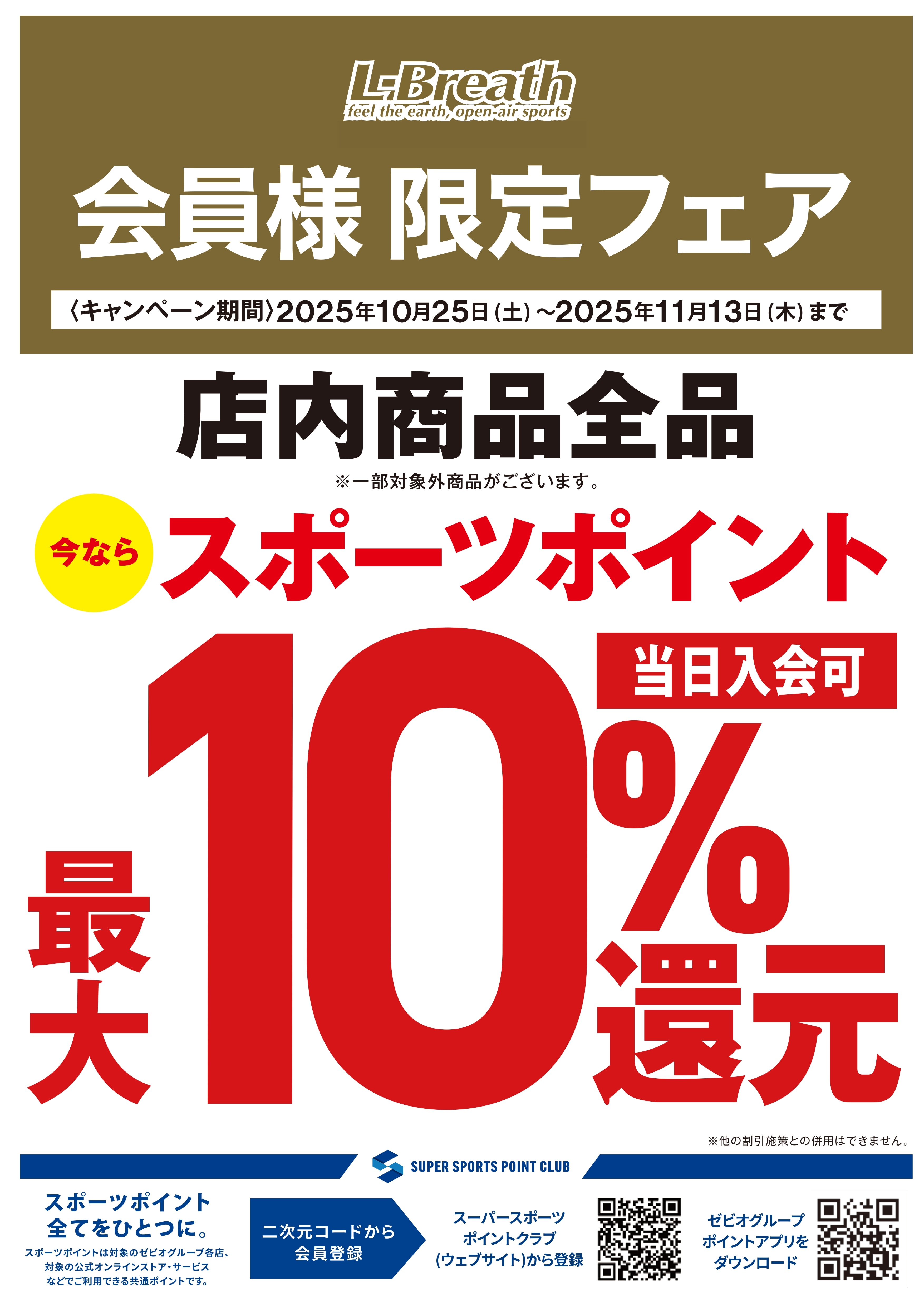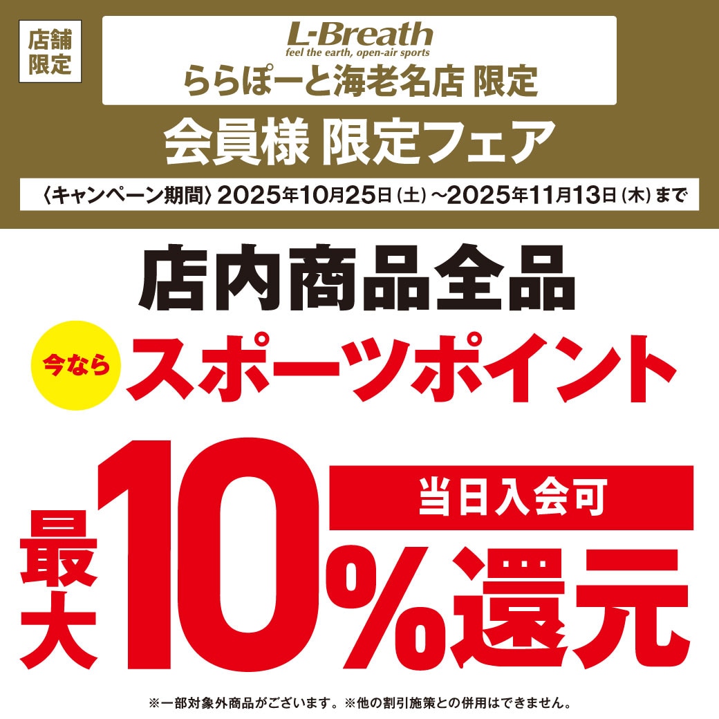 10月25日(土)~11月13日(木)まで の期間中、L-Breathららぽーと海老名店 限定で店内商品全品 スポーツポイント最大10%還元 させていただきます。 ■ポイント還元詳細 ・カードお支払いでで100円につき10ポイント還元 ・現金お支払いで100円につき10ポイント還元 ・その他の支払いで200円につき20ポイント還元 ※スポーツポイントカード、ゼビオカード、ヴィクトリアカード、スポーツポイントデジタル会員画面のご提示が必要です。 ※オンラインストアは対象外となります スポーツポイントカード・ヴィクトリアカード・ ゼビオカード・スポーツポイント会員様 限定の施策となります。 当日入会もOK。無料でご登録いただけます。 詳しくは店舗ナビゲーターまで お問合せください。