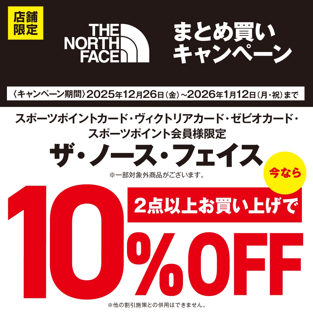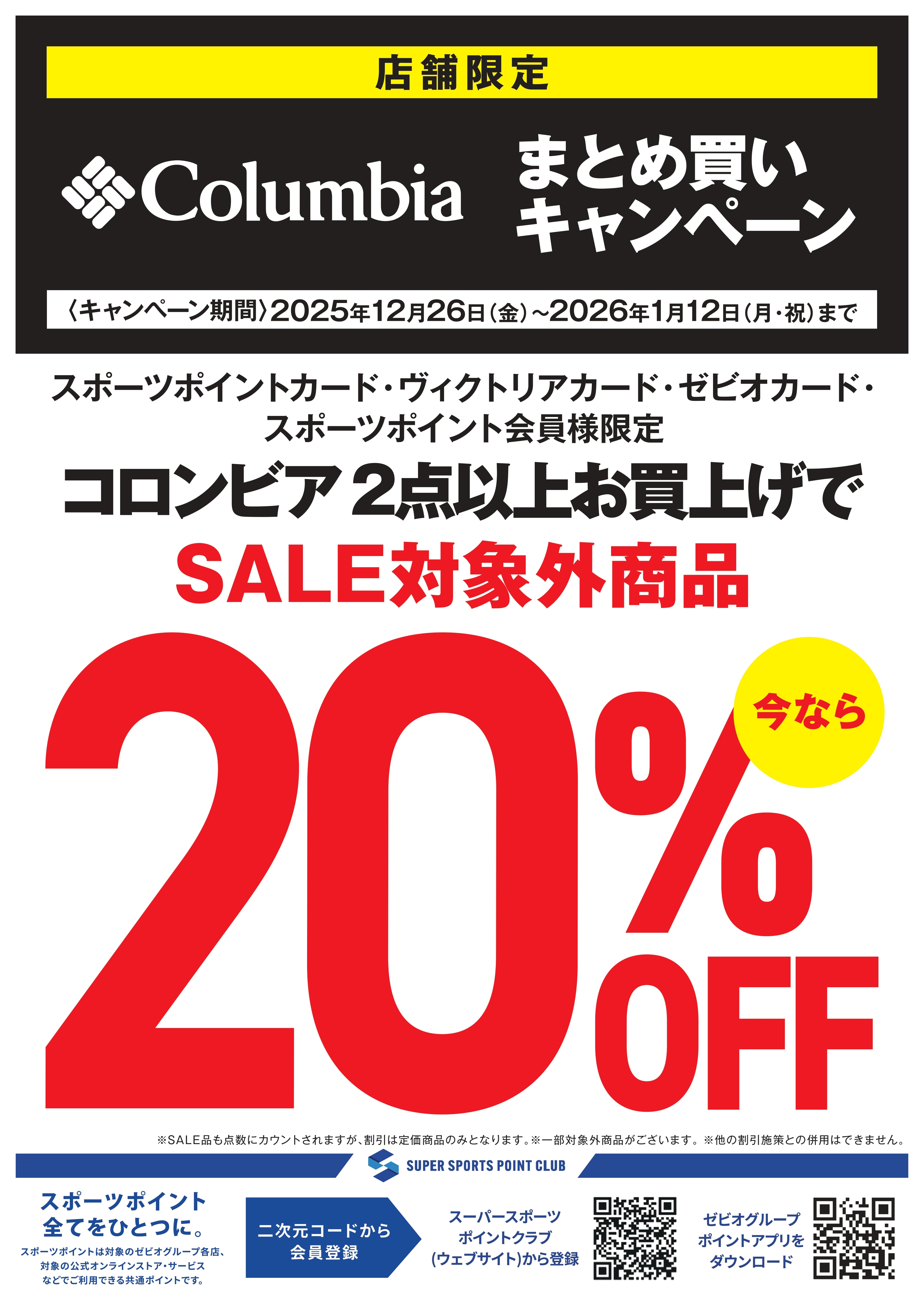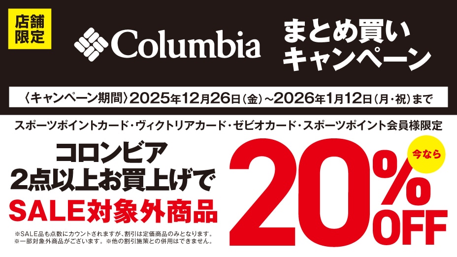 12月26日(金)~1月12日(木)まで の期間中、対象店舗限定で コロンビア商品を2点以上ご購入で セール外商品を20%OFF させていただきます。 ※セール外商品とセール品購入の場合、 セール外商品のみ割引させていただきます。 ※セール外商品2点購入の場合、 2点とも割引させていただきます。 ※オンラインストアは対象外となります スポーツポイントカード・ヴィクトリアカード・ ゼビオカード・スポーツポイント会員様 限定の施策となります。 当日入会もOK。無料でご登録いただけます。 詳しくは店舗ナビゲーターまで お問合せください。
