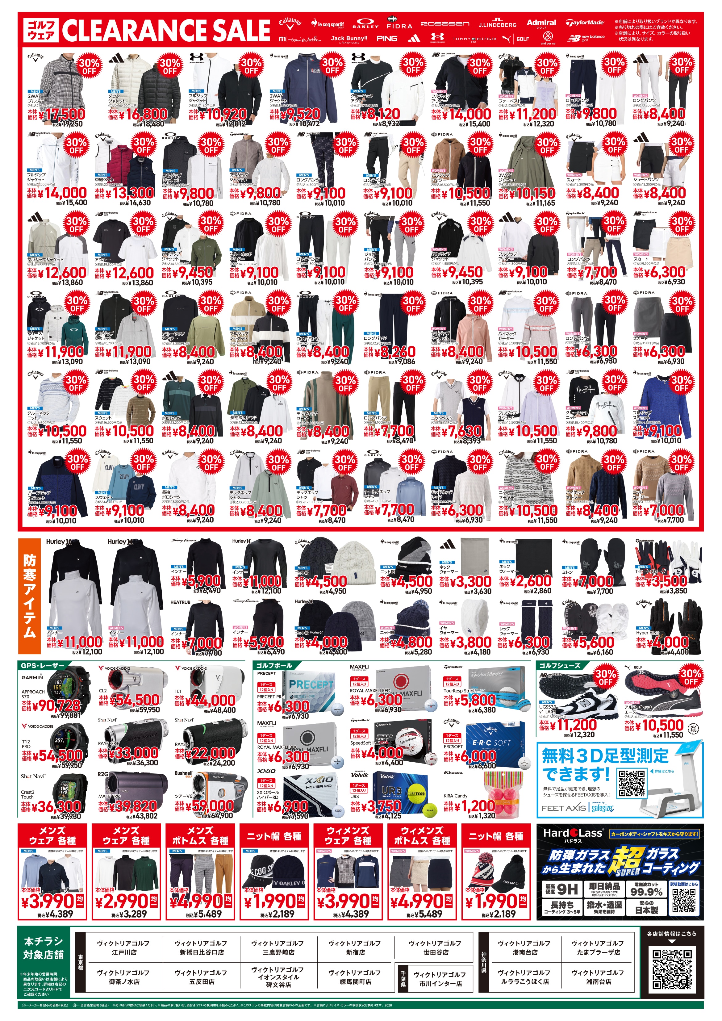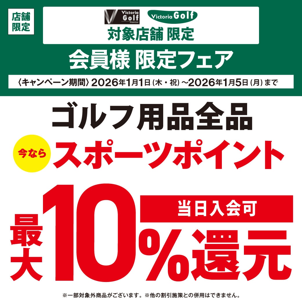 詳細は、各店舗までお問い合わせください。 ■対象店舗 <東京都> ヴィクトリアゴルフ 新宿店 ヴィクトリアゴルフ 江戸川店 ヴィクトリアゴルフ 世田谷店 ヴィクトリアゴルフ 五反田店 ヴィクトリアゴルフ 練馬関町店 ヴィクトリアゴルフ 三鷹野崎店 ヴィクトリアゴルフ 御茶ノ水店 ヴィクトリアゴルフ イオンスタイル碑文谷店 ヴィクトリアゴルフ 新橋日比谷口店 ヴィクトリアゴルフ イオンモールむさし村山店 ヴィクトリアゴルフ オリナス錦糸町店 ヴィクトリアゴルフ アリオ葛西店 <神奈川県> ヴィクトリアゴルフ 港南台店 ヴィクトリアゴルフ たまプラーザ店 ヴィクトリアゴルフ 湘南台店 ヴィクトリアゴルフ ルララこうほく店 <埼玉県> PGAツアースーパーストア 大宮店 ヴィクトリアゴルフ スポーツモール越谷イオンレイクタウン店 <千葉県> ヴィクトリアゴルフ 市川インター店