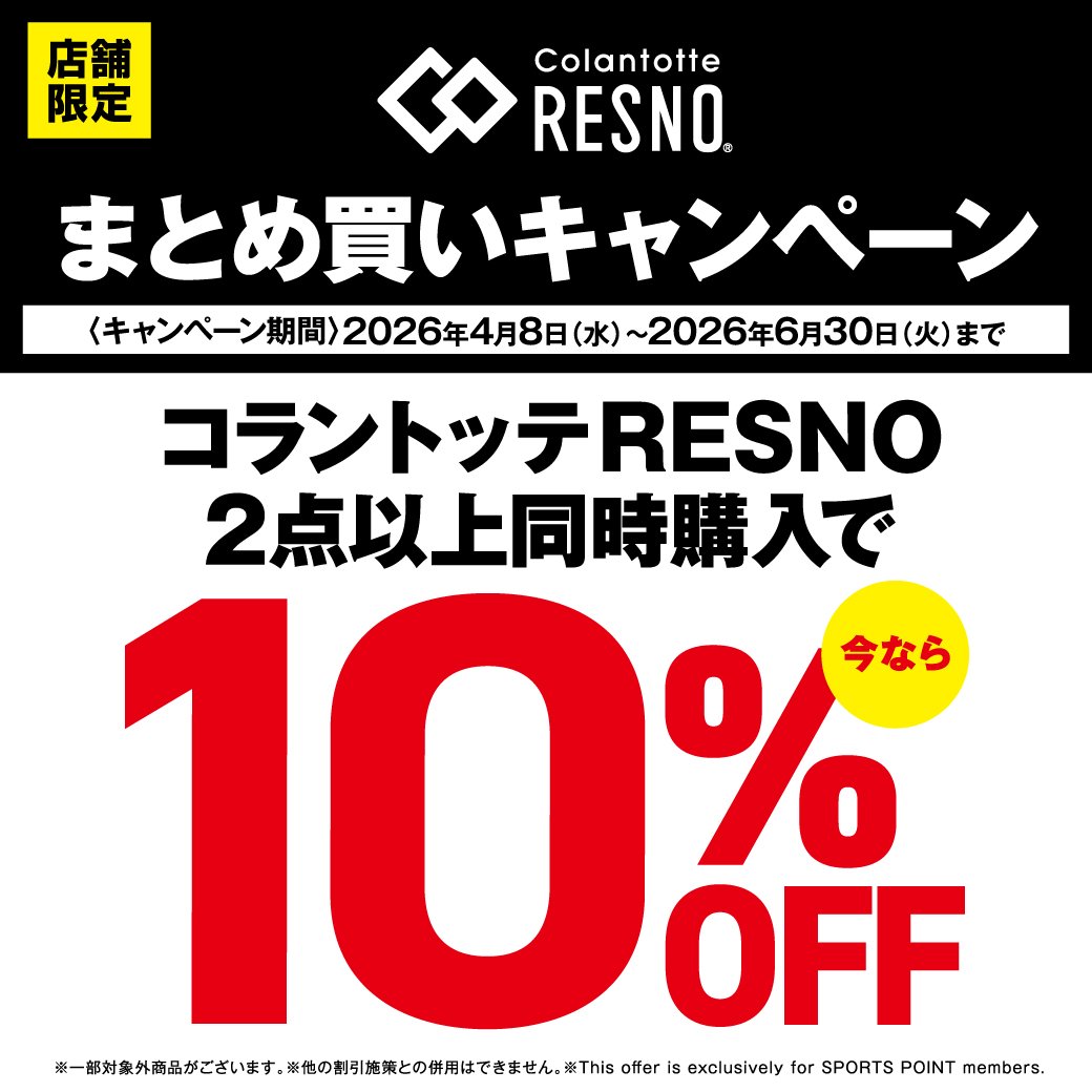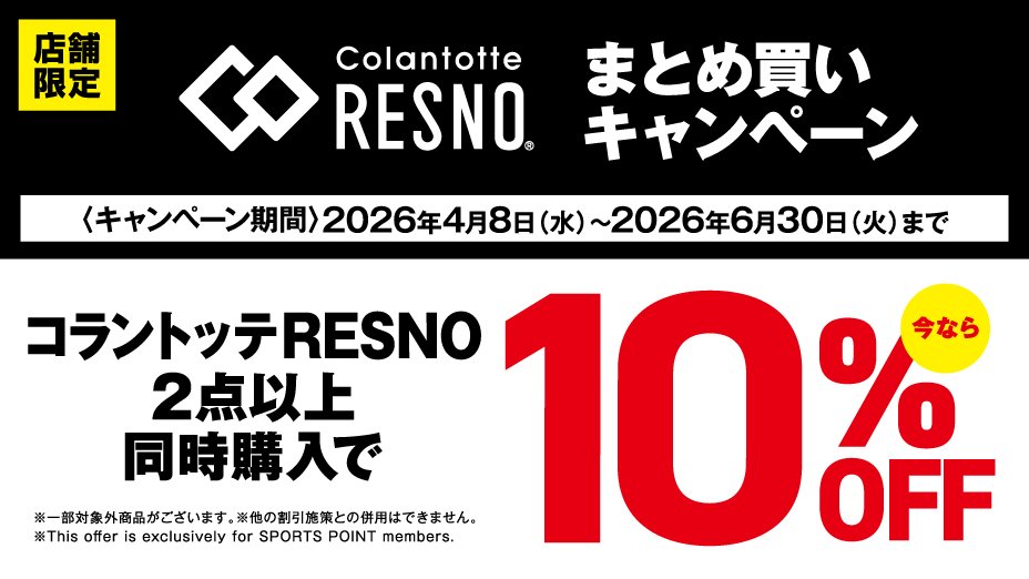 4月8日(水)~6月30日(火)まで の期間中、対象店舗限定で コラントッテRESNO商品を 2点以上ご購入で10%OFF させていただきます。 ※一部対象外商品がございます ※オンラインストアは対象外となります スポーツポイントカード・スポーツポイント会員様 限定の施策となります。 当日入会もOK。無料でご登録いただけます。 詳しくは店舗ナビゲーターまで お問合せください。