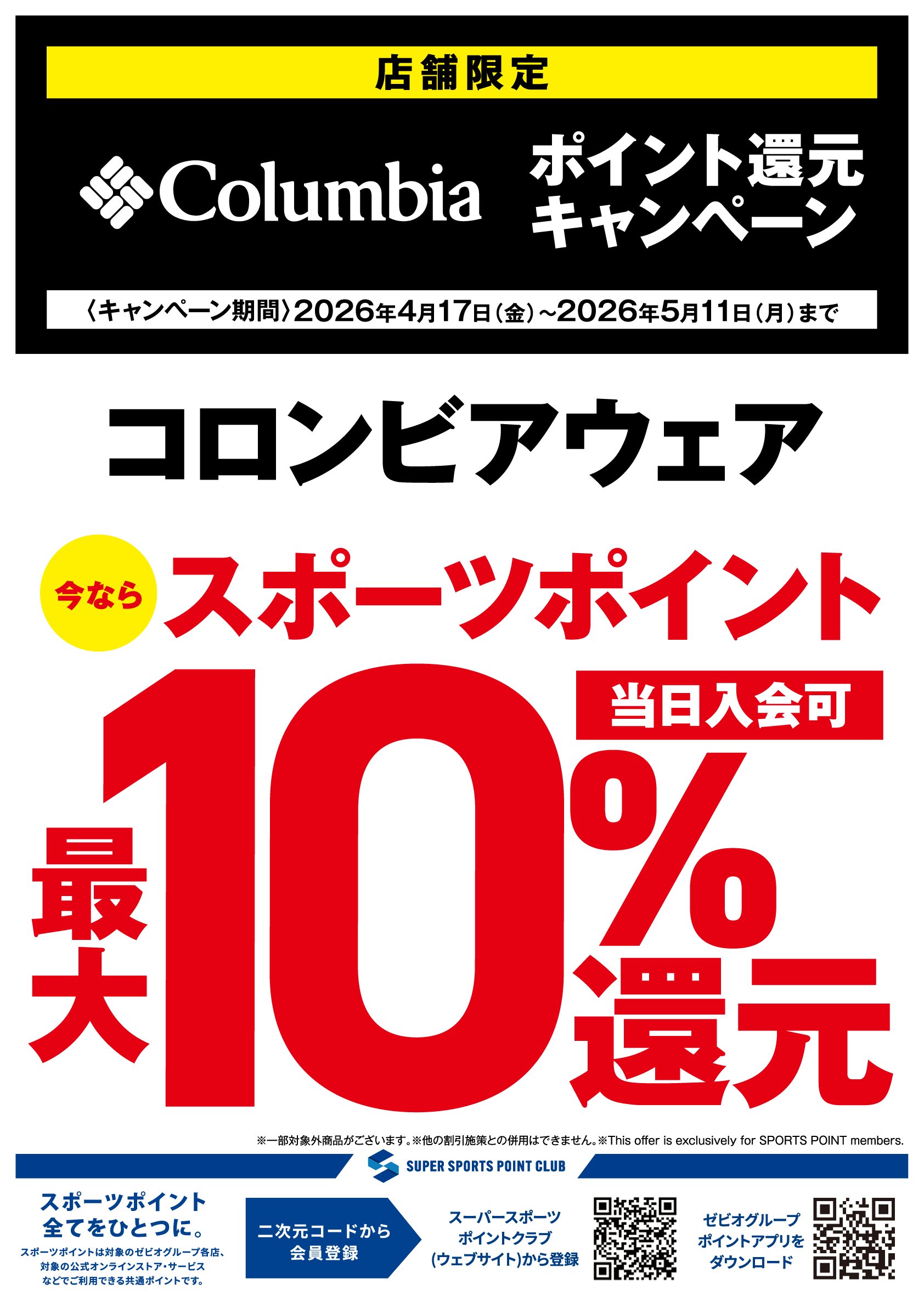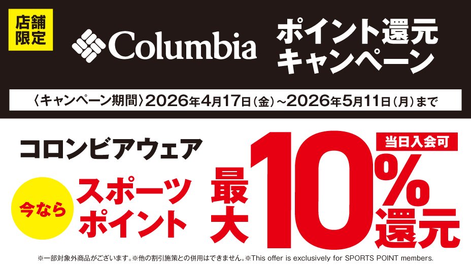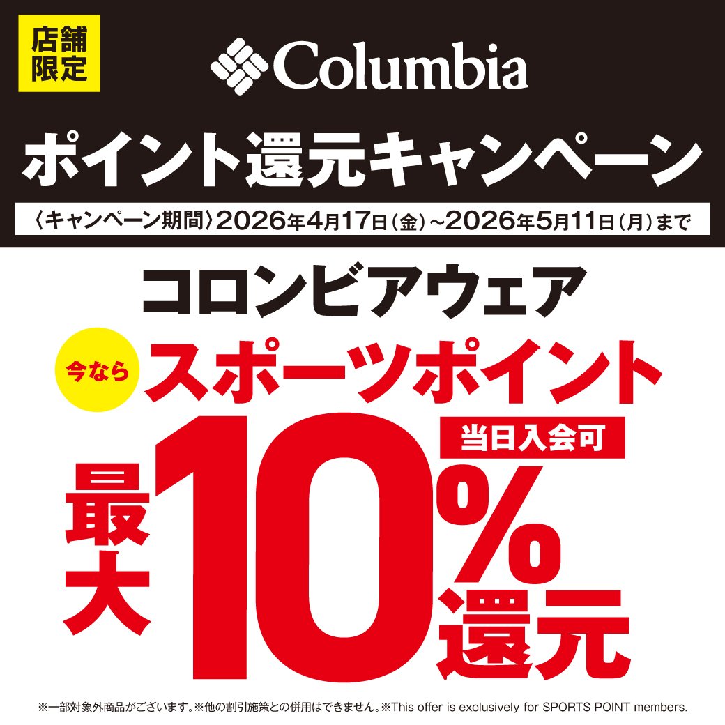 4月17日(金)~5月11日(月)までの 期間中、コロンビアウェアをご購入で スポーツポイント10%還元 させていただきます。 ■ポイント還元詳細 ・カードお支払いでで100円につき10ポイント還元 ・現金お支払いで100円につき10ポイント還元 ・その他の支払いで200円につき20ポイント還元 スポーツポイントカード・ スポーツポイント会員様限定キャンペーン となります。 ※会員画面のご提示が必要です。 当日入会もOK。無料でご登録いただけます。 詳しくは店舗ナビゲーターまで お問合せください。