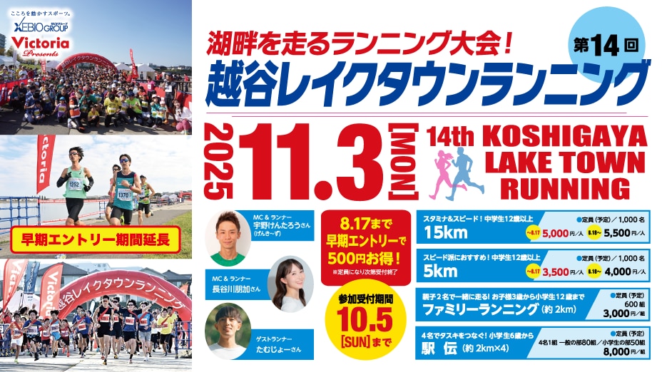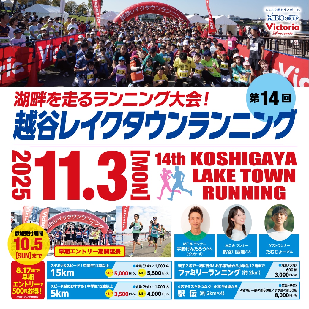 2025年11月3日(月・祝) 第14回越谷レイクタウンランニングを 開催致します。 参加受付期間は2025年10月5日(日)まで。 ※定員になり次第受付終了 ■期日 2025年11月3日(月・祝) ■会場 越谷レイクタウン湖畔周辺 ■種目 【15Km】 参加費:5,500円 ★中学生12歳以上参加可能 【5Km】 参加費:4,000円 ★中学生12歳以上参加可能 【ファミリーランニング】 (約2Km) 参加費:3,000円 ★親子2人1組で一緒に走る お子様3歳から小学生12歳まで 【駅伝】 (約2Km×4名) 参加費:8,000円 ★4名でタスキをつなぐ・小学生6歳から参加可能 ■主催 越谷レイクタウンランニング実行委員会/ 一般社団法人 越谷青年会議所越谷商工会議所青年部/ 一般社団法人越谷市観光協会/ 株式会社ヴィクトリア(ゼビオグループ) ■協力 ㈱東急エージェンシープロミックス ■特別協賛 ゼビオホールディングス・株式会社ヴィクトリア