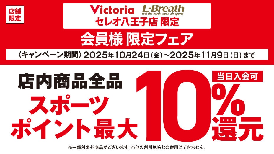 10月24日(金)~11月9日(日)まで の期間中、Victoriaセレオ八王子店 限定で店内商品全品 スポーツポイント最大10%還元 させていただきます。 ■ポイント還元詳細 ・カードお支払いでで100円につき10ポイント還元 ・現金お支払いで100円につき10ポイント還元 ・その他の支払いで200円につき20ポイント還元 ※スポーツポイントカード、ゼビオカード、ヴィクトリアカード、スポーツポイントデジタル会員画面のご提示が必要です。 ※オンラインストアは対象外となります スポーツポイントカード・ヴィクトリアカード・ ゼビオカード・スポーツポイント会員様 限定の施策となります。 当日入会もOK。無料でご登録いただけます。 詳しくは店舗ナビゲーターまで お問合せください。