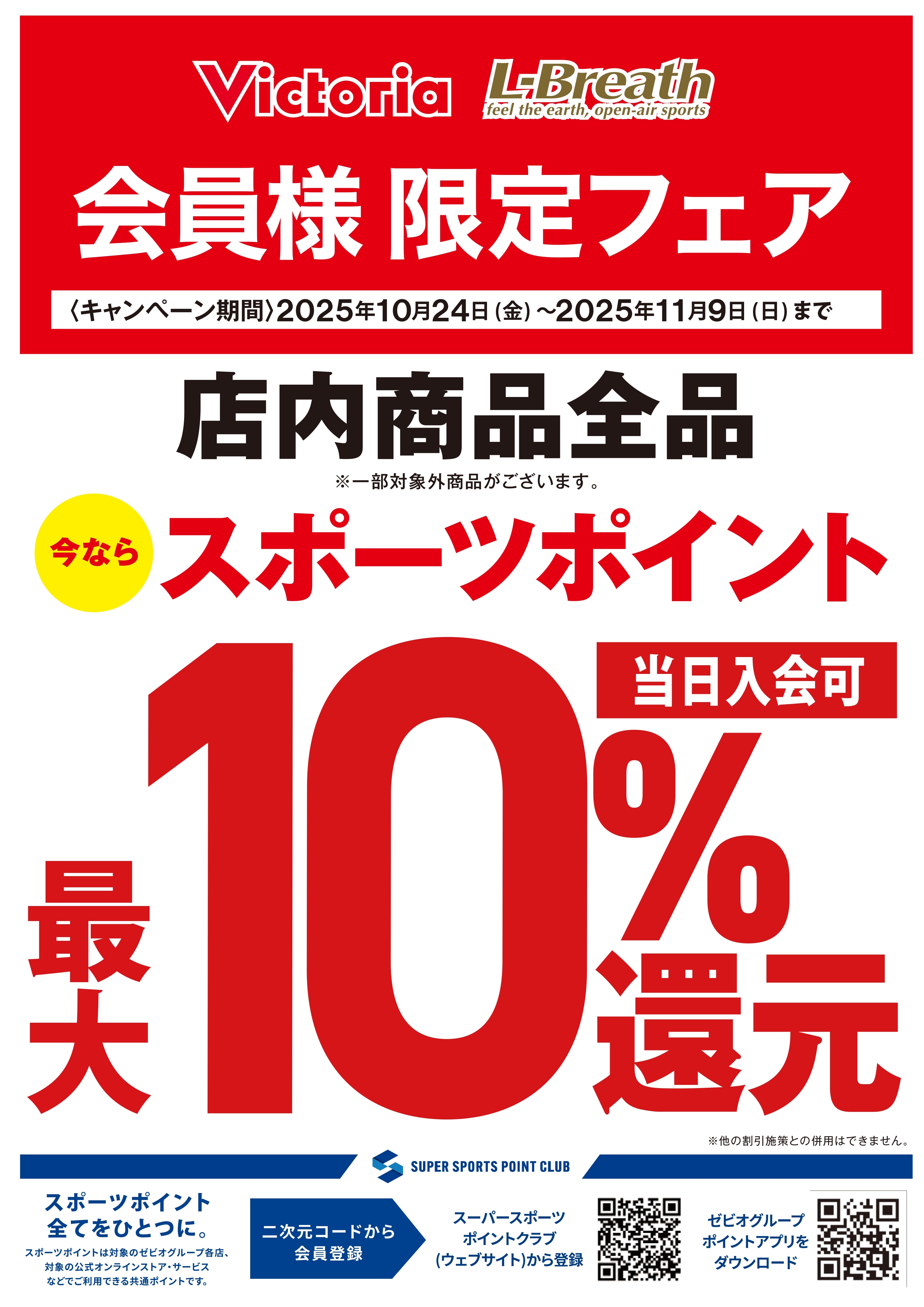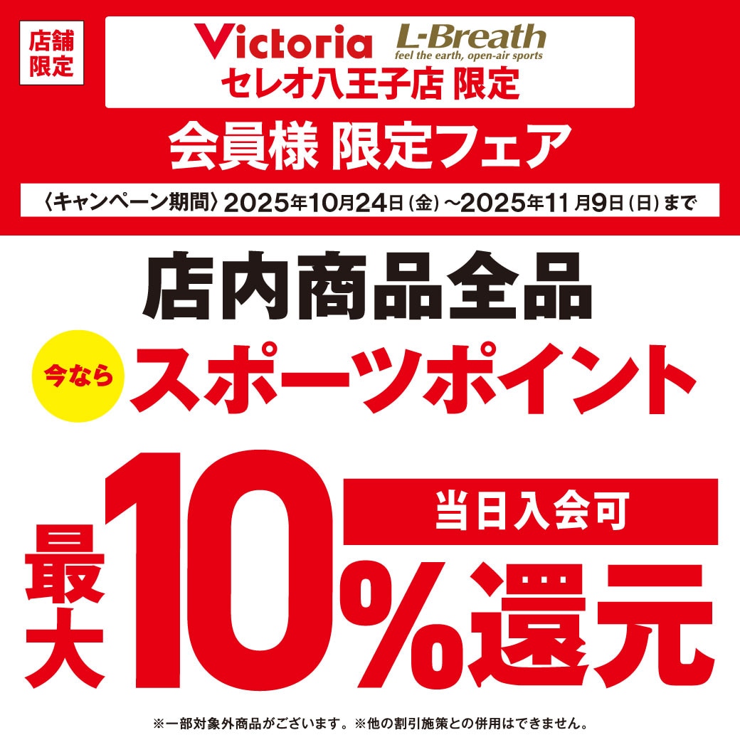 10月24日(金)~11月9日(日)まで の期間中、Victoriaセレオ八王子店 限定で店内商品全品 スポーツポイント最大10%還元 させていただきます。 ■ポイント還元詳細 ・カードお支払いでで100円につき10ポイント還元 ・現金お支払いで100円につき10ポイント還元 ・その他の支払いで200円につき20ポイント還元 ※スポーツポイントカード、ゼビオカード、ヴィクトリアカード、スポーツポイントデジタル会員画面のご提示が必要です。 ※オンラインストアは対象外となります スポーツポイントカード・ヴィクトリアカード・ ゼビオカード・スポーツポイント会員様 限定の施策となります。 当日入会もOK。無料でご登録いただけます。 詳しくは店舗ナビゲーターまで お問合せください。