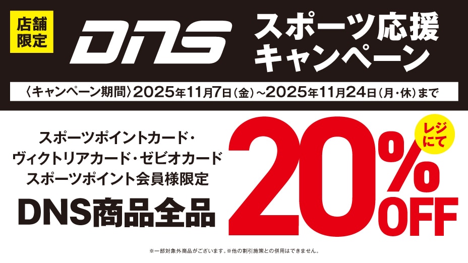 11月7日(金)~11月24日(月・祝)までの 期間中、DNS商品 をご購入でレジにて20%OFF させていただきます。 ※他の割引施策との併用はできません ※オンラインストアは対象外となります スポーツポイントカード・ヴィクトリアカード・ ゼビオカード・スポーツポイント会員様 限定の施策となります。 当日入会もOK。無料でご登録いただけます。 詳しくは店舗ナビゲーターまで お問合せください。