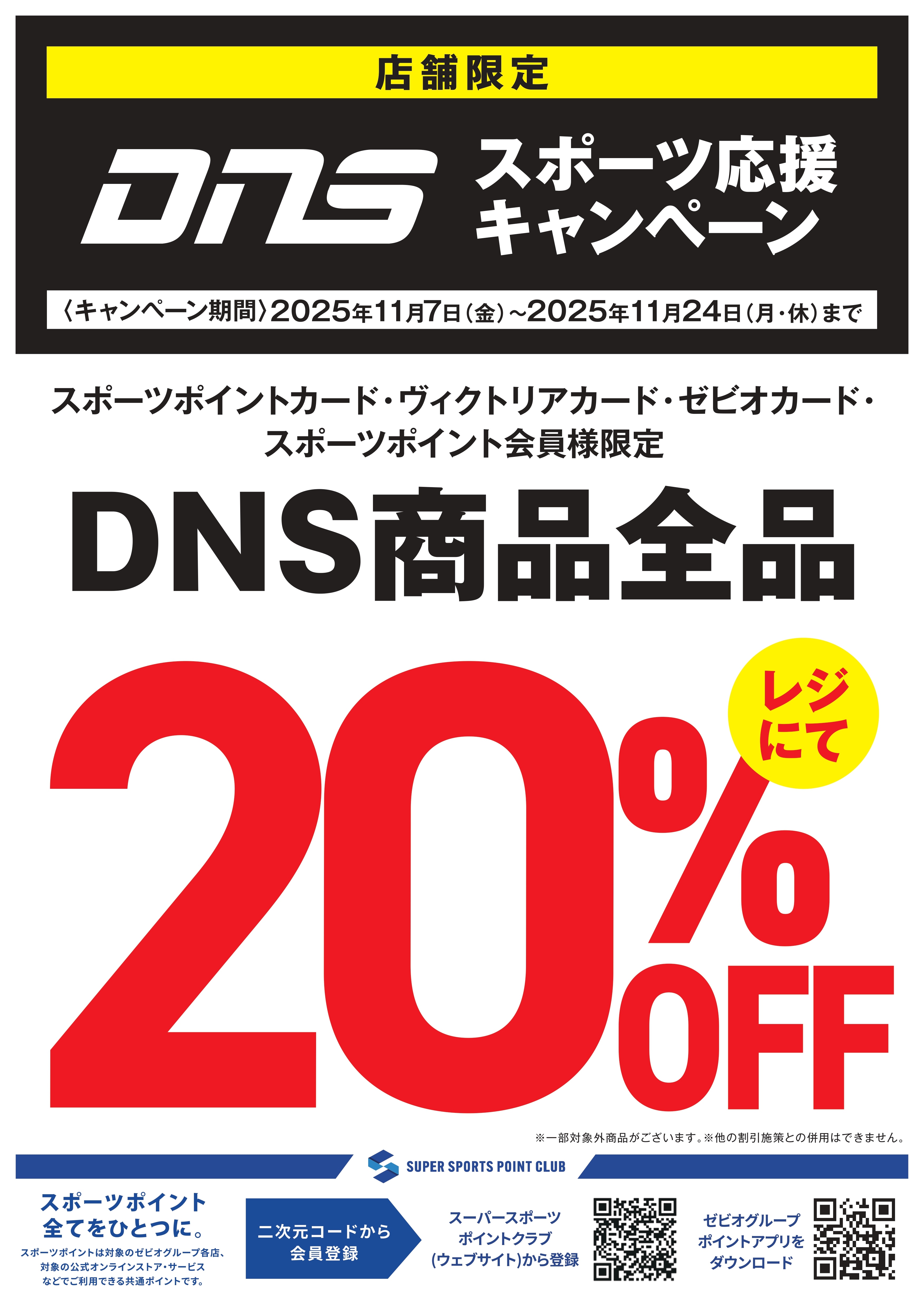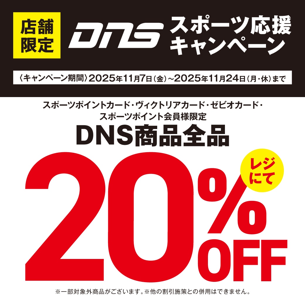 11月7日(金)~11月24日(月・祝)までの 期間中、DNS商品 をご購入でレジにて20%OFF させていただきます。 ※他の割引施策との併用はできません ※オンラインストアは対象外となります スポーツポイントカード・ヴィクトリアカード・ ゼビオカード・スポーツポイント会員様 限定の施策となります。 当日入会もOK。無料でご登録いただけます。 詳しくは店舗ナビゲーターまで お問合せください。