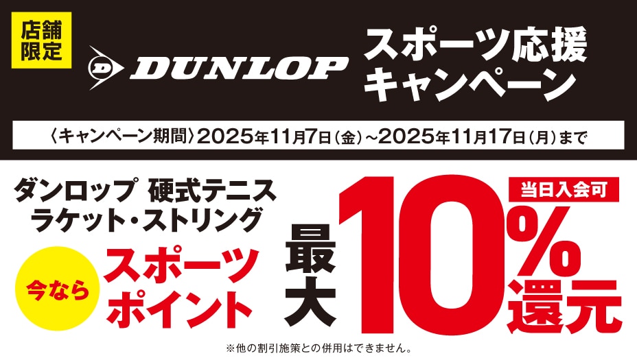 11月7日(金)~11月17日(月)までの 期間中、ダンロップ硬式テニスラケット・ストリングを ご購入でスポーツポイント最大10%還元 させていただきます。 ■ポイント還元詳細 ・カードお支払いでで100円につき10ポイント還元 ・現金お支払いで100円につき10ポイント還元 ・その他の支払いで200円につき20ポイント還元 ※スポーツポイントカード、ゼビオカード、ヴィクトリアカード、スポーツポイントデジタル会員画面のご提示が必要です。 ※オンラインストアは対象外となります スポーツポイントカード・ヴィクトリアカード・ ゼビオカード・スポーツポイント会員様 限定の施策となります。 当日入会もOK。無料でご登録いただけます。 詳しくは店舗ナビゲーターまで お問合せください。