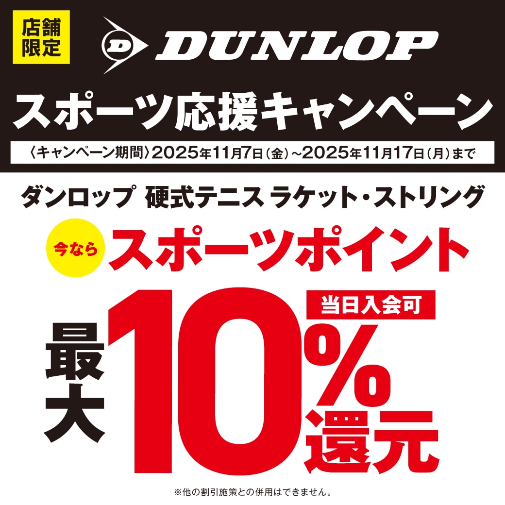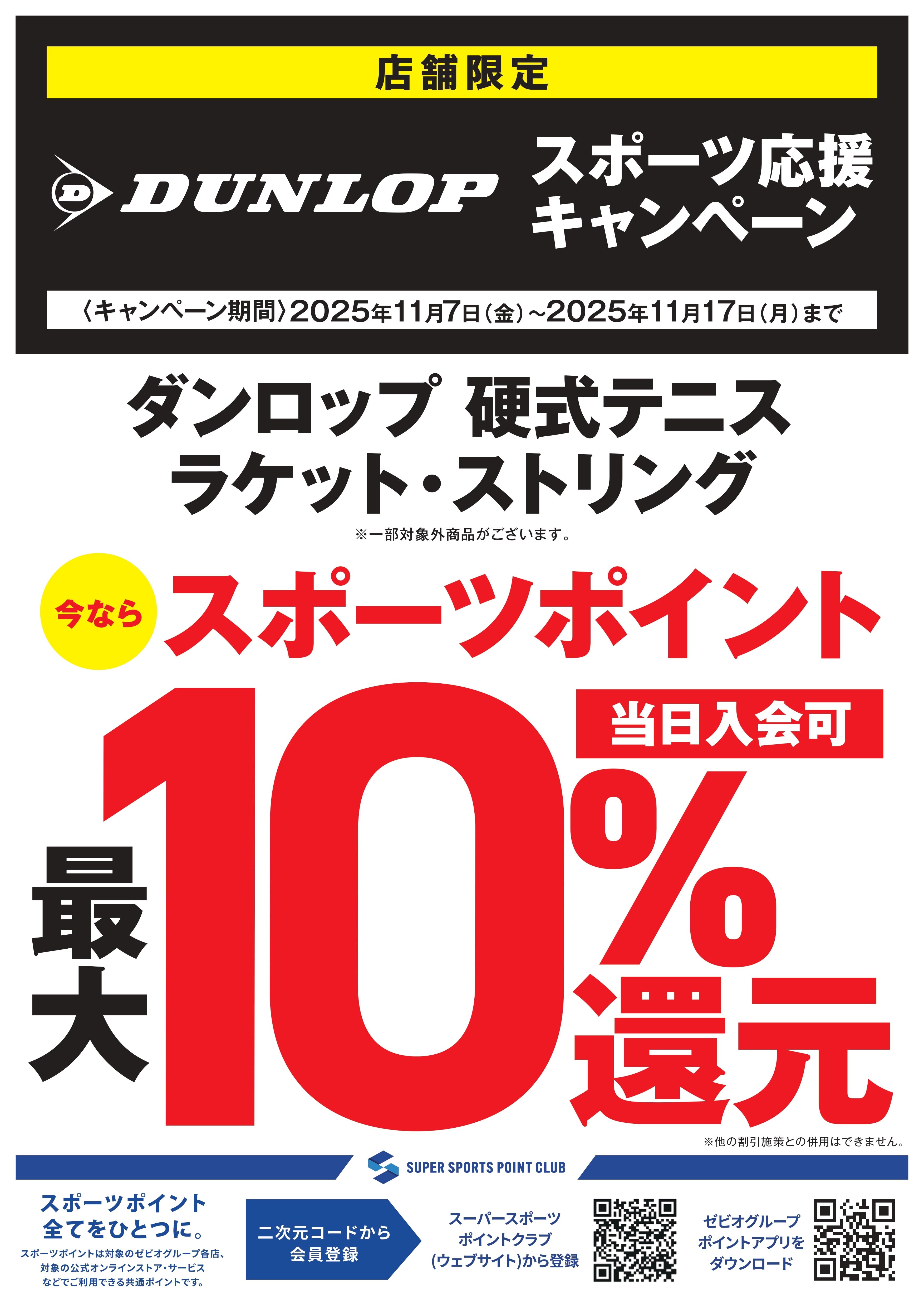 11月7日(金)~11月17日(月)までの 期間中、ダンロップ硬式テニスラケット・ストリングを ご購入でスポーツポイント最大10%還元 させていただきます。 ■ポイント還元詳細 ・カードお支払いでで100円につき10ポイント還元 ・現金お支払いで100円につき10ポイント還元 ・その他の支払いで200円につき20ポイント還元 ※スポーツポイントカード、ゼビオカード、ヴィクトリアカード、スポーツポイントデジタル会員画面のご提示が必要です。 ※オンラインストアは対象外となります スポーツポイントカード・ヴィクトリアカード・ ゼビオカード・スポーツポイント会員様 限定の施策となります。 当日入会もOK。無料でご登録いただけます。 詳しくは店舗ナビゲーターまで お問合せください。