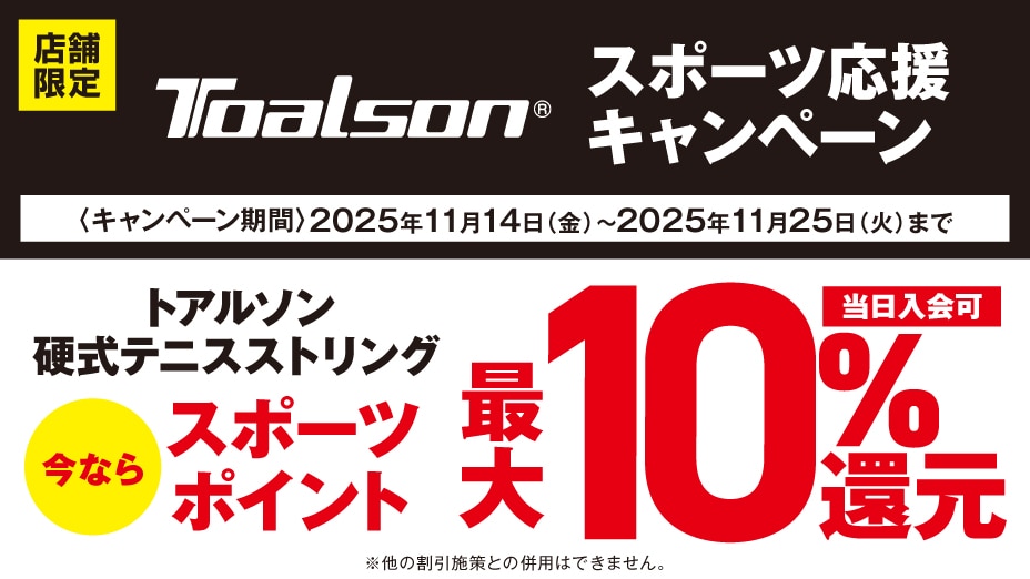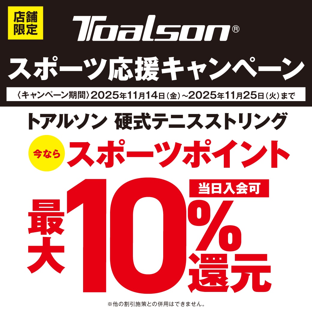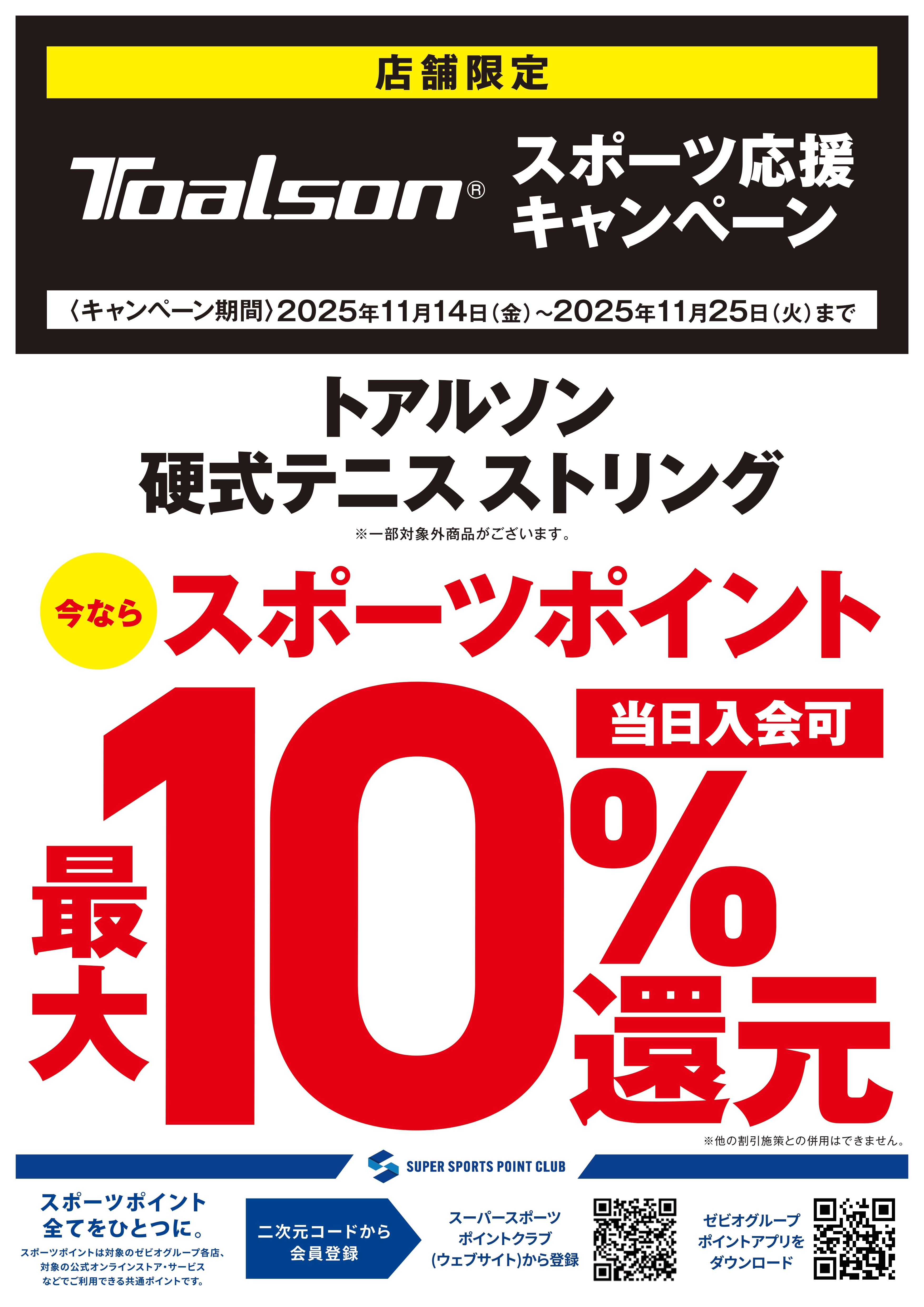 11月14日(金)~11月25日(火)までの 期間中、トアルソン硬式テニスストリングを ご購入でスポーツポイント最大10%還元 させていただきます。 ■ポイント還元詳細 ・カードお支払いでで100円につき10ポイント還元 ・現金お支払いで100円につき10ポイント還元 ・その他の支払いで200円につき20ポイント還元 ※スポーツポイントカード、ゼビオカード、ヴィクトリアカード、スポーツポイントデジタル会員画面のご提示が必要です。 ※オンラインストアは対象外となります スポーツポイントカード・ヴィクトリアカード・ ゼビオカード・スポーツポイント会員様 限定の施策となります。 当日入会もOK。無料でご登録いただけます。 詳しくは店舗ナビゲーターまで お問合せください。