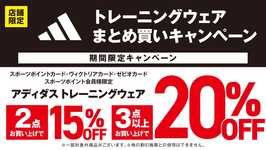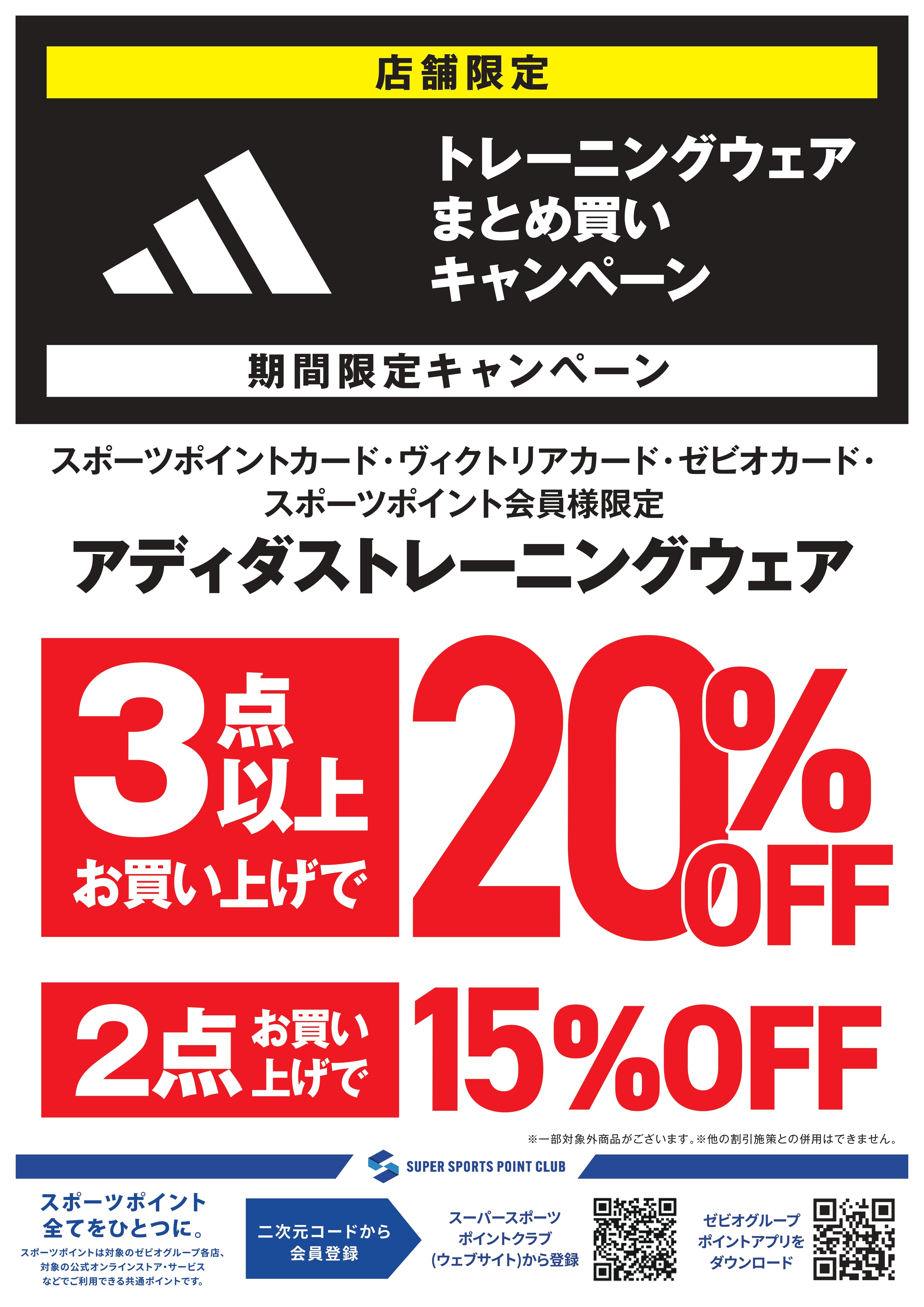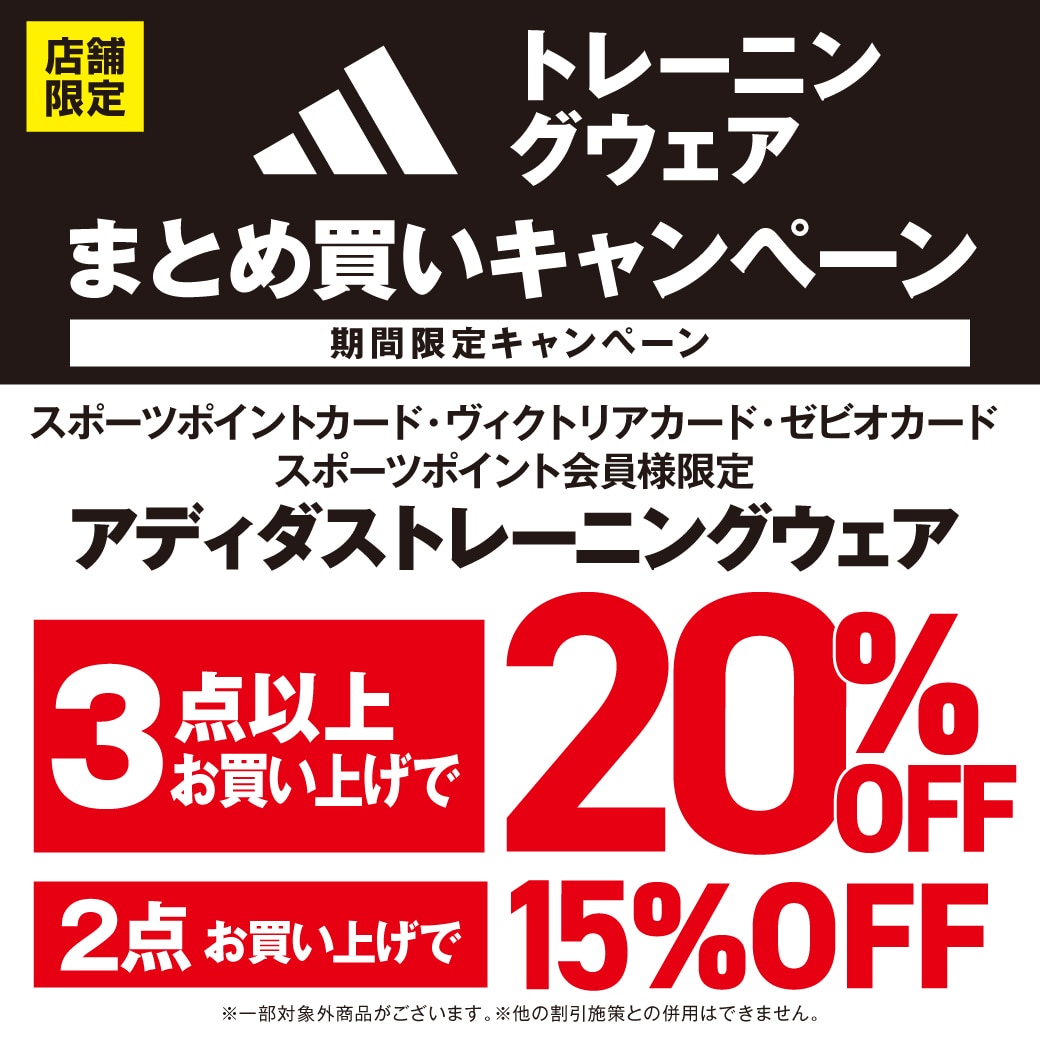 11月28日(金)~12月11日(木)までの 期間中、アディダストレーニングウェア をまとめてご購入いただくと 同時購入点数により レジにて割引させていただきます。 2点ご購入で15%OFF 3点以上ご購入で20%OFF ■対象商品 ・アパレルウェア ・スポーツウェア ※一部対象外商品がございます ※オンラインストアは対象外となります スポーツポイントカード・ヴィクトリアカード・ ゼビオカード・スポーツポイント会員様 限定の施策となります。 当日入会もOK。無料でご登録いただけます。 詳しくは店舗ナビゲーターまで お問合せください。