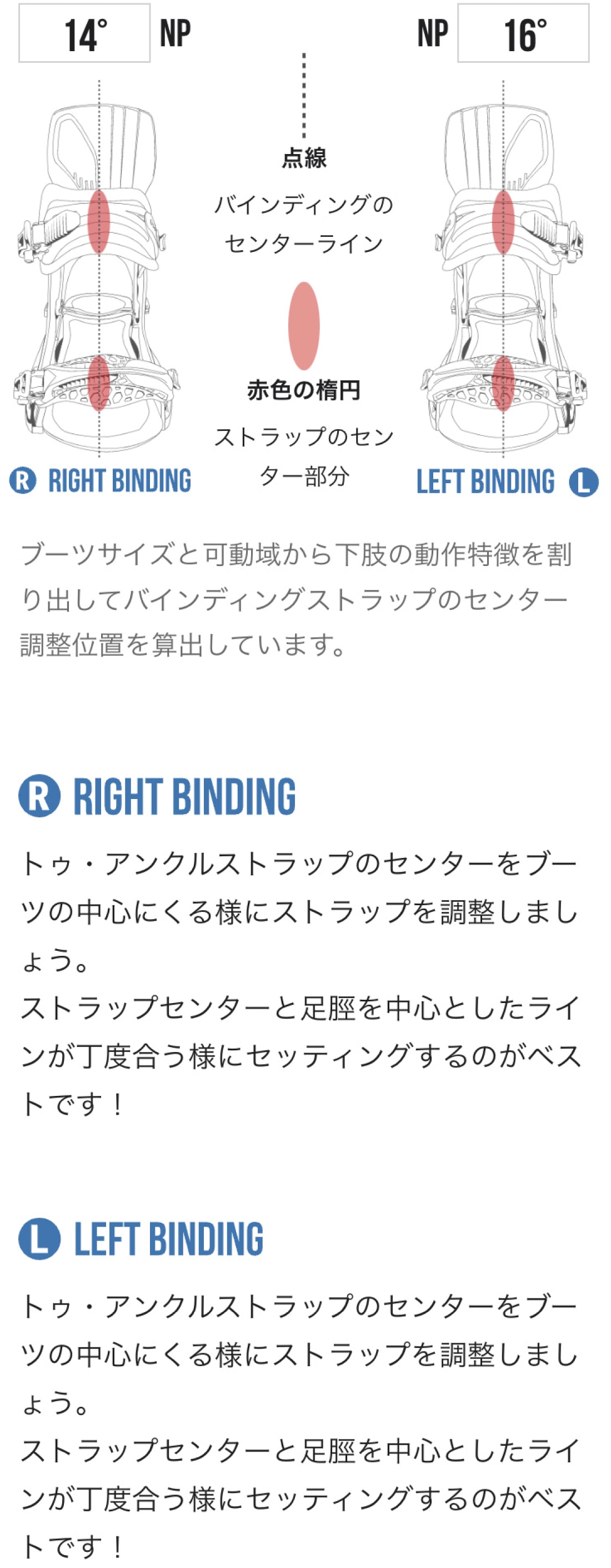スノーボード上で立つ位置( 向き、角度、足幅 )の推奨値を100 万人を超えるスノーボーダーの身体データを基に算出。