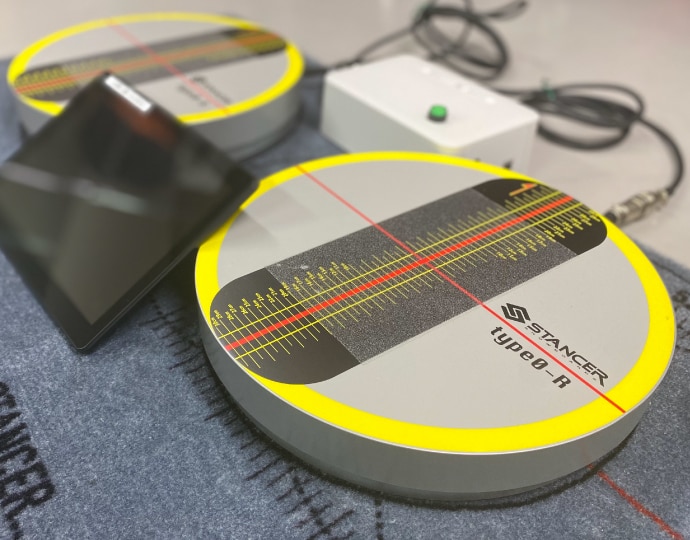 STANCERは、立位での股関節回旋可動範囲を計測することで、人によって異なる身体の特徴を導き出します。また、検出した回旋範囲から左右の中心角度(ニュートラルポイント)を算出し、その値を基準にスノーボード上で立つ位置(向き、角度、足幅)の推奨値をライディングスタイルに合わせて3通り印字します。