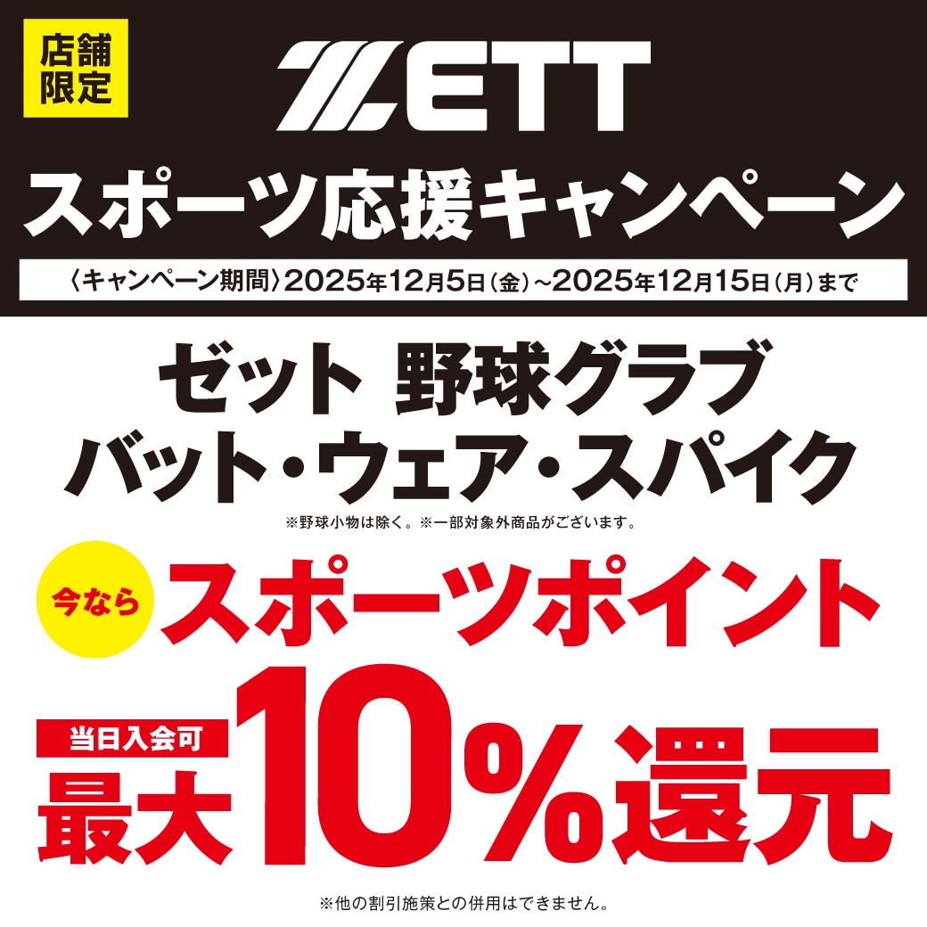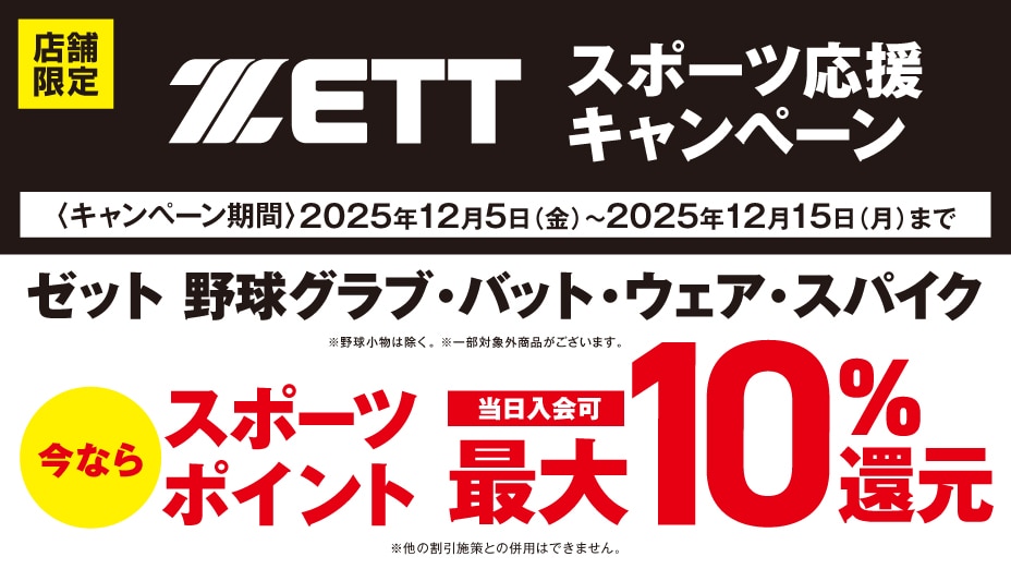 12月5日(金)~12月15日(月)までの 期間中、ゼット野球用品を ご購入でスポーツポイント最大10%還元 させていただきます。 ■対象商品 ・野球グラブ ・野球バット ・野球ウェア ・野球スパイク ※野球小物は対象外 ■ポイント還元詳細 ・カードお支払いでで100円につき10ポイント還元 ・現金お支払いで100円につき10ポイント還元 ・その他の支払いで200円につき20ポイント還元 ※スポーツポイントカード、ゼビオカード、ヴィクトリアカード、スポーツポイントデジタル会員画面のご提示が必要です。 ※オンラインストアは対象外となります スポーツポイントカード・ヴィクトリアカード・ ゼビオカード・スポーツポイント会員様 限定の施策となります。 当日入会もOK。無料でご登録いただけます。 詳しくは店舗ナビゲーターまで お問合せください。