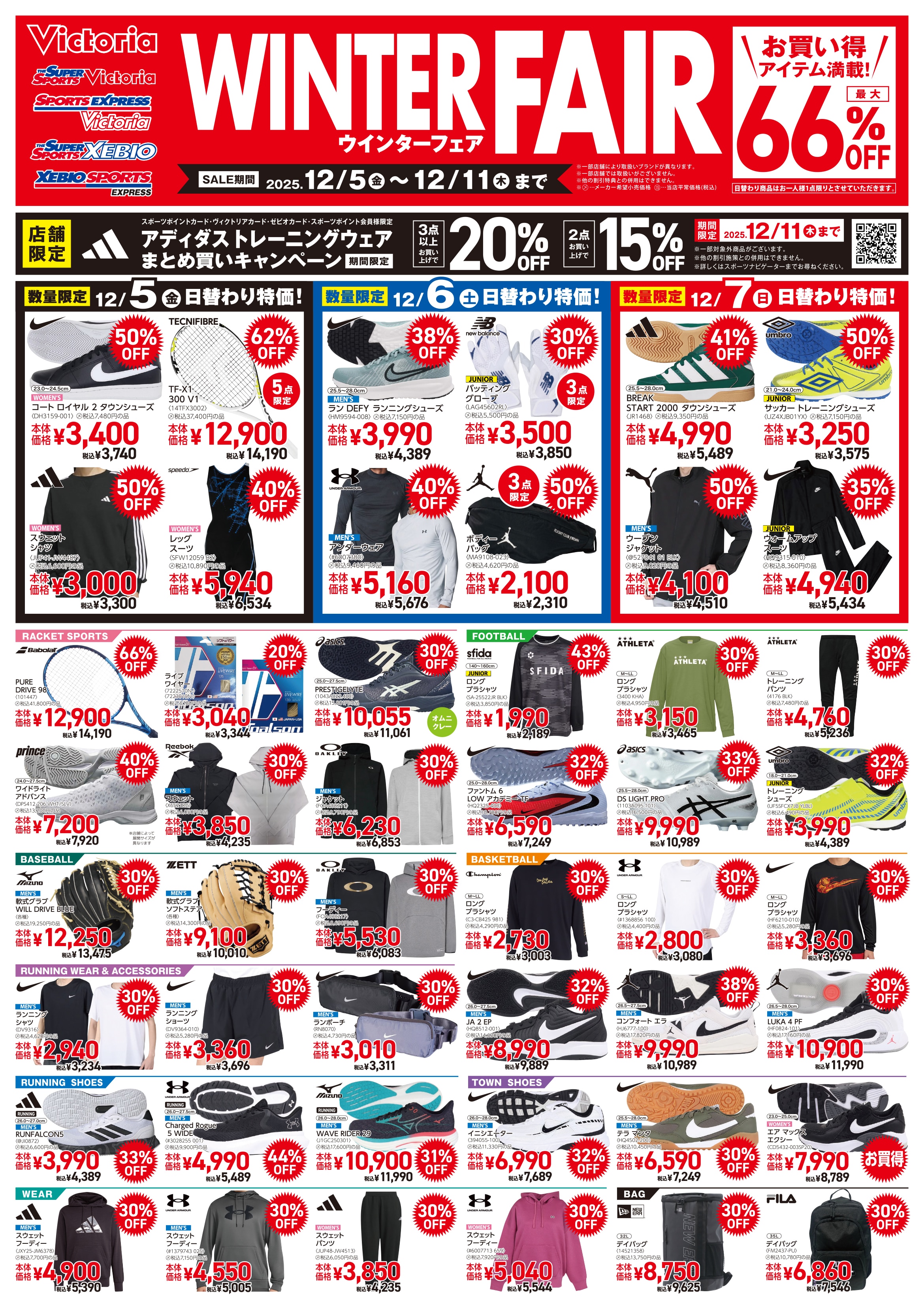 5日(金)~7日(日)の3日間、 お一人様1点限りの数量限定日替わり商品 が登場! スウェットシャツやタウンシューズ、 バッグが最大50%OFF、 競技用品が最大62%OFF!