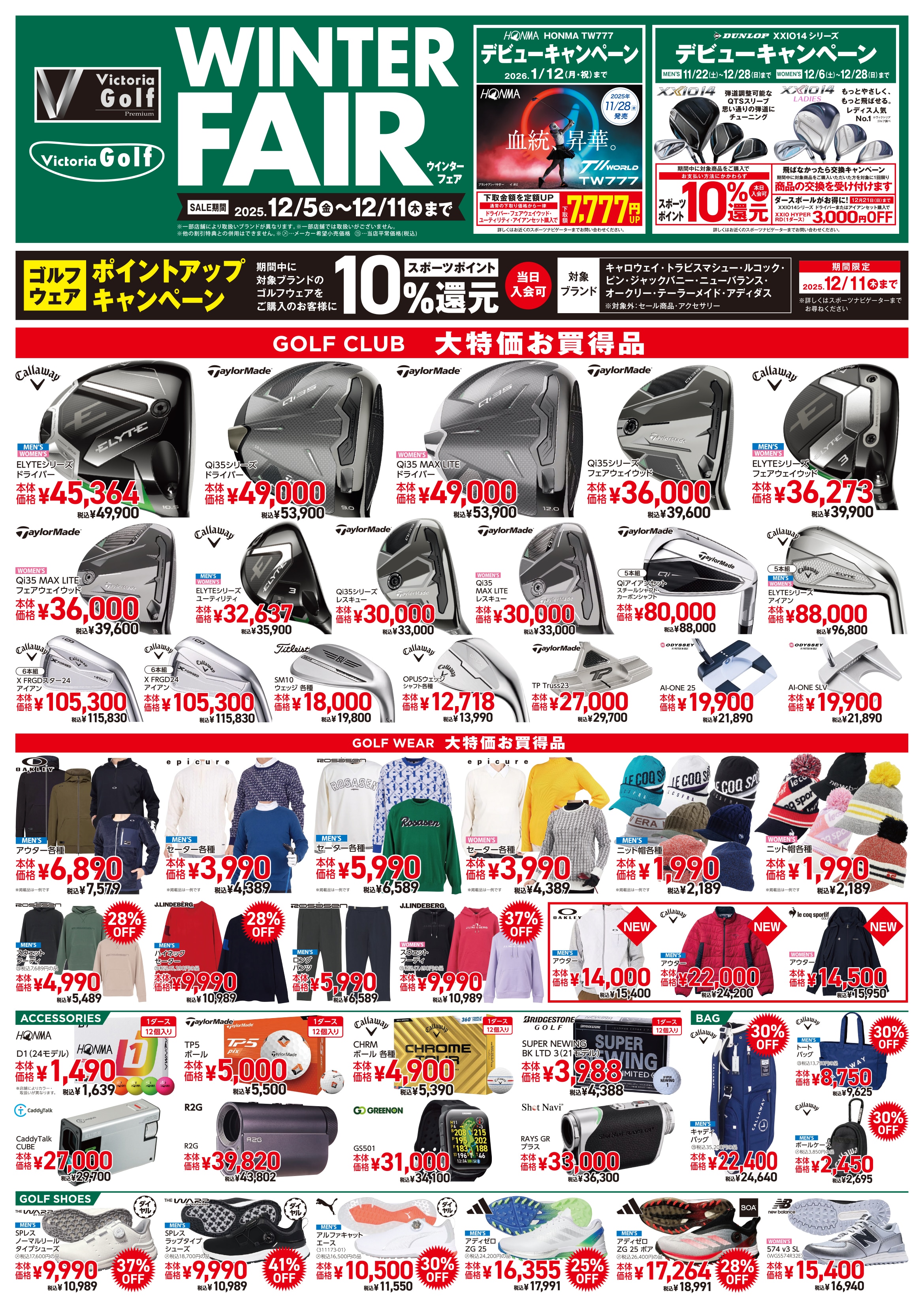 Callaway「ELYTE」,TaylorMade「Qi35」 など人気定番ゴルフクラブが大特価! ゴルフセーターが本体価格¥3,990~、 スウェットが最大37%OFF、 シューズが最大41%OFFと、 幅広いカテゴリーで大幅割引!