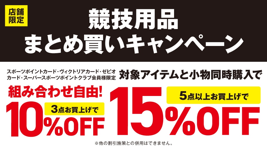 12月12日(金)から、 野球、テニス、サッカー、バスケ、バレー の対象グッズと対象小物を まとめてご購入いただくと 同時購入点数により レジにて割引させていただきます。 3点ご購入で10%OFF 5点以上ご購入で15%OFF ■競技別対象グッズ ・野球グラブ ・テニスラケット ・サッカーシューズ ・バスケットボールシューズ ・バレーシューズ ※競技により対象小物は変わります。 ※他の割引施策との併用はできません ※オンラインストアは対象外となります スポーツポイントカード・ヴィクトリアカード・ ゼビオカード・スポーツポイント会員様 限定の施策となります。 当日入会もOK。無料でご登録いただけます。 詳しくは店舗ナビゲーターまで お問合せください。