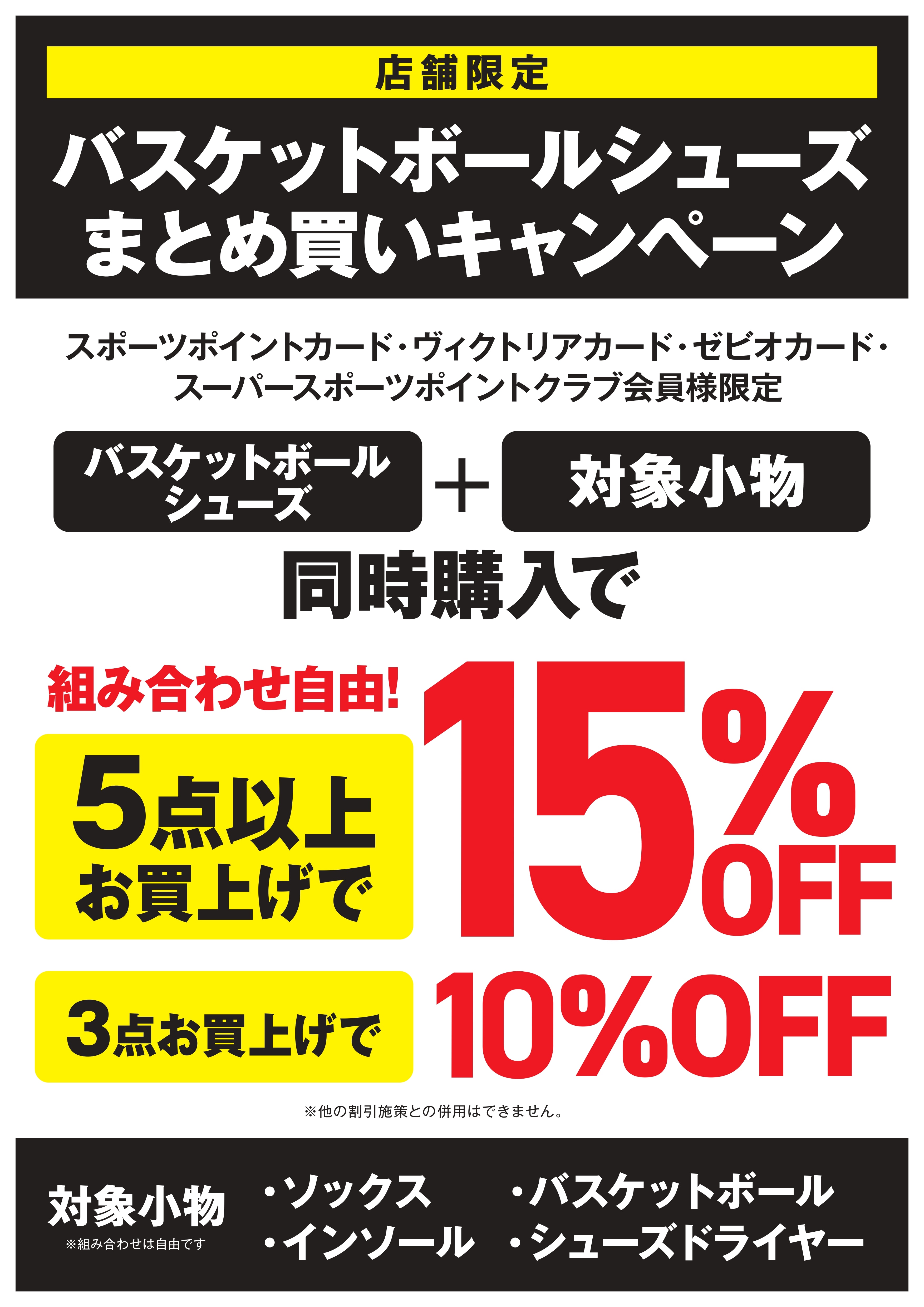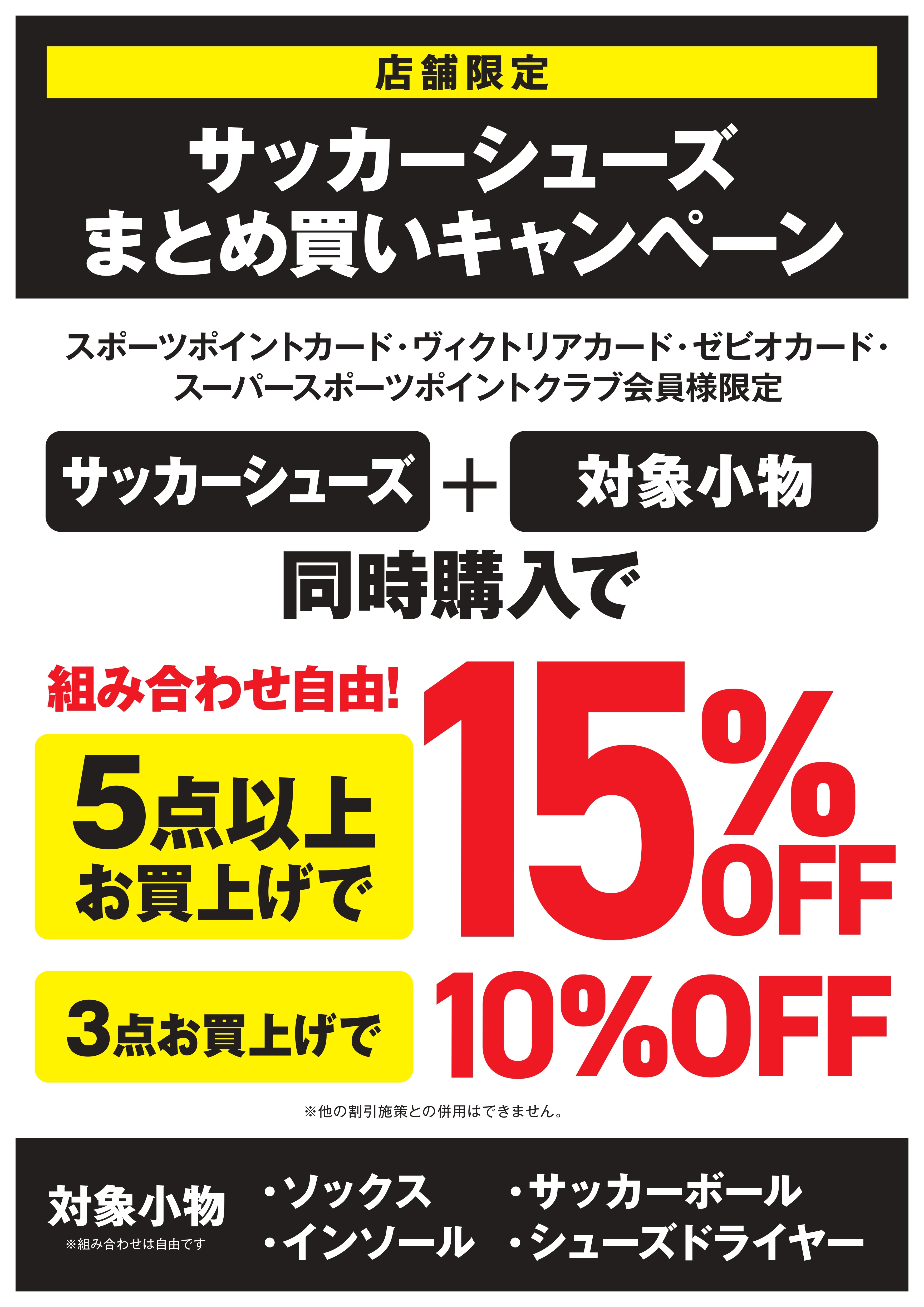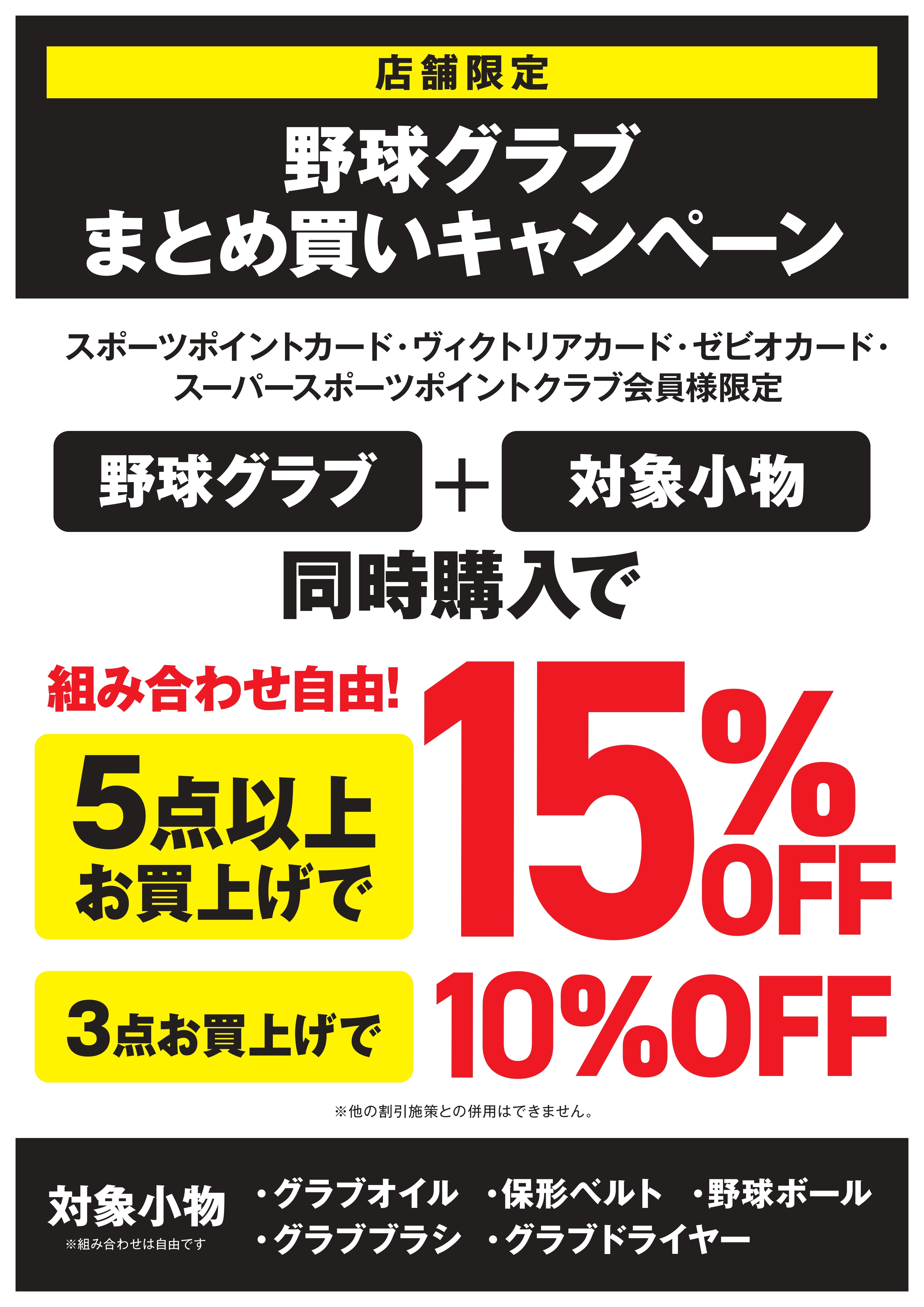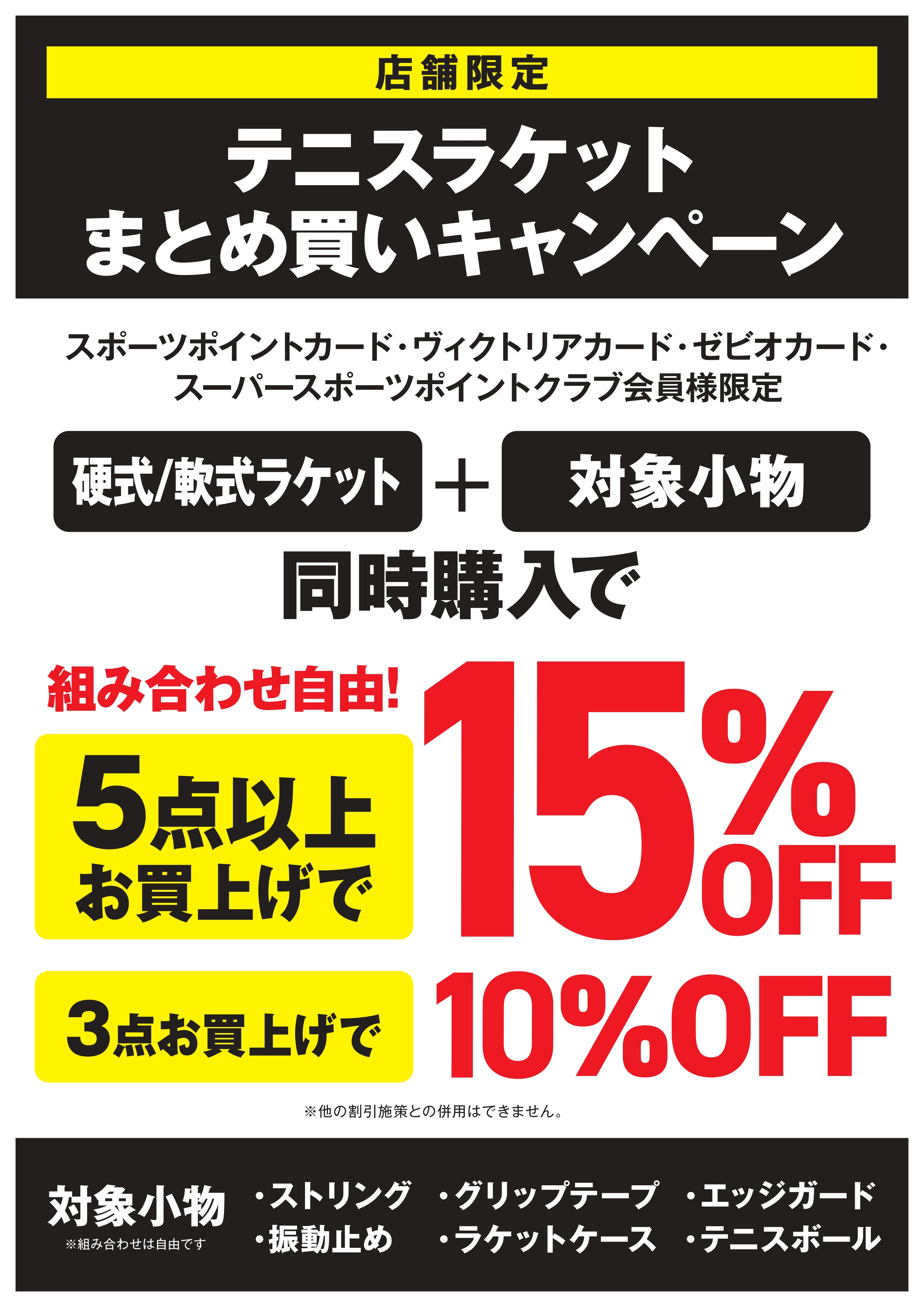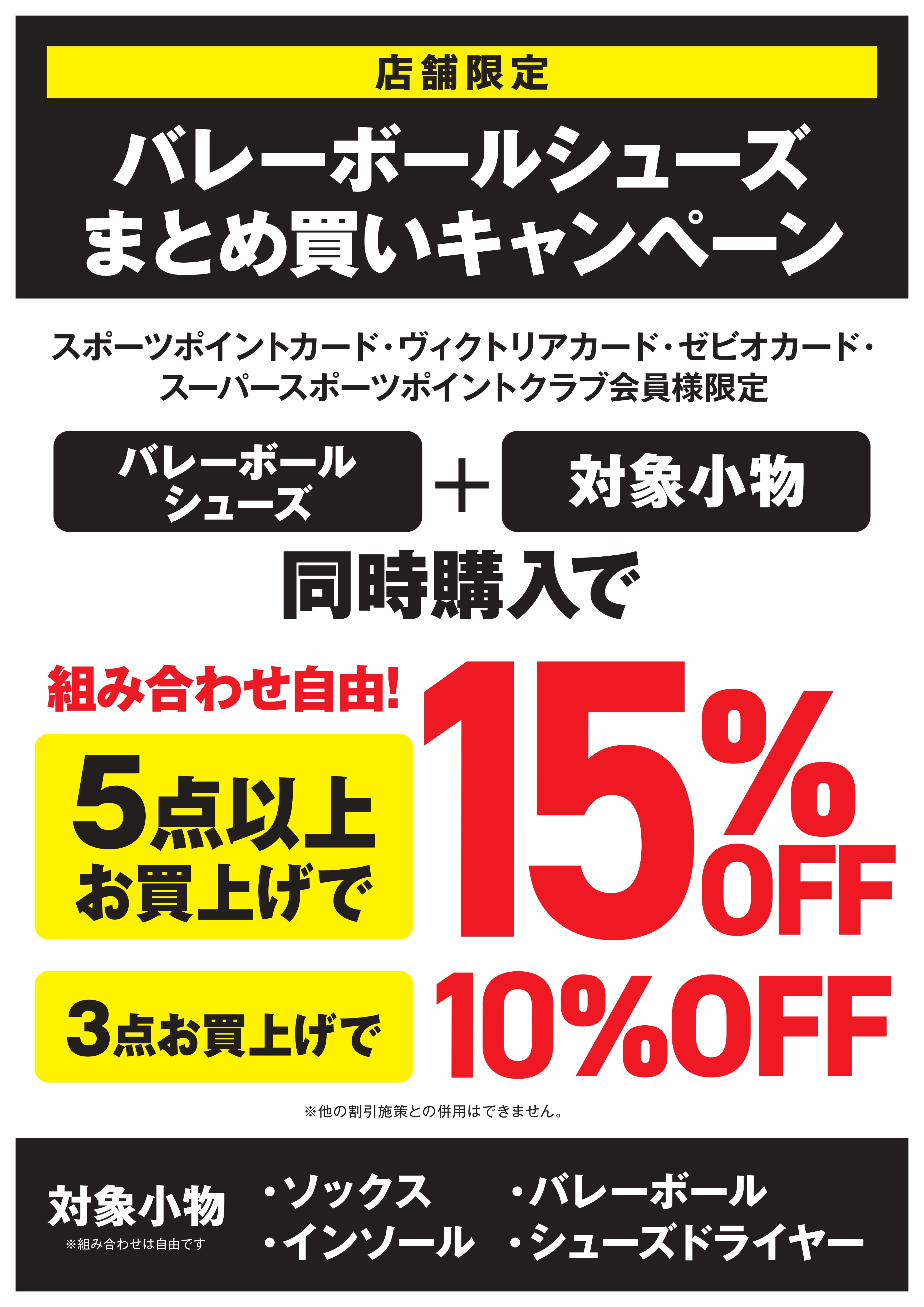 12月12日(金)から、 野球、テニス、サッカー、バスケ、バレー の対象グッズと対象小物を まとめてご購入いただくと 同時購入点数により レジにて割引させていただきます。 3点ご購入で10%OFF 5点以上ご購入で15%OFF ■競技別対象グッズ ・野球グラブ ・テニスラケット ・サッカーシューズ ・バスケットボールシューズ ・バレーシューズ ※競技により対象小物は変わります。 ※他の割引施策との併用はできません ※オンラインストアは対象外となります スポーツポイントカード・ヴィクトリアカード・ ゼビオカード・スポーツポイント会員様 限定の施策となります。 当日入会もOK。無料でご登録いただけます。 詳しくは店舗ナビゲーターまで お問合せください。