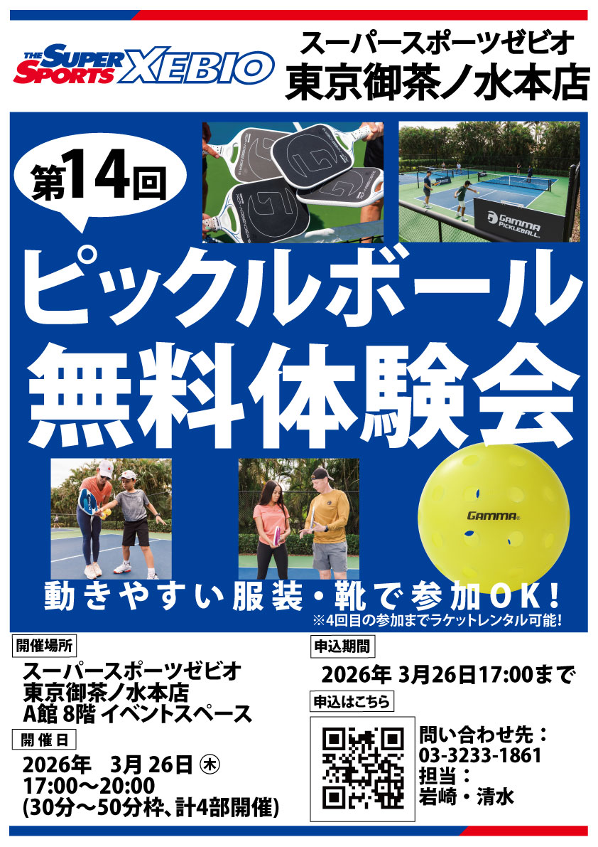 ピックルボールとはアメリカで生まれた テニス・卓球・バドミントンの要素を 組み合わせたNEWラケットスポーツ。 開催日:2026年3月26日(木) 開催時間:17:00~20:00(30分~50分枠・計4部開催) ・1部 17:00~17:50 (過去に参加経験のあるかた) ・2部 18:00~18:29(どなたでも) ・3部 18:30~18:59(どなたでも) ・4部 19:10~20:00 (過去に参加経験のあるかた) ※1部・4部は2回目以上の方がご参加いただけます。 2部・3部はどなたでもご参加いただけます。 ※貸し出しラケットは体験会参加4回目まで無料 開催場所:スーパースポーツゼビオ東京御茶ノ水 本店 A館8階イベントスペース 申込期間:~2025年3月26日(木)17:00まで 申込方法:モシコム お問い合わせ先 電話番号:03-3233-1861 担当:岩崎・清水