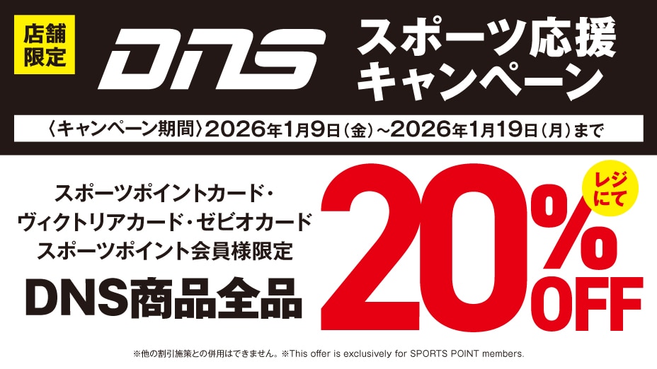1月9日(金)~1月19日(月・祝)までの 期間中、DNS商品 をご購入でレジにて20%OFF させていただきます。 ※他の割引施策との併用はできません ※オンラインストアは対象外となります スポーツポイントカード・ヴィクトリアカード・ ゼビオカード・スポーツポイント会員様 限定の施策となります。 当日入会もOK。無料でご登録いただけます。 詳しくは店舗ナビゲーターまで お問合せください。