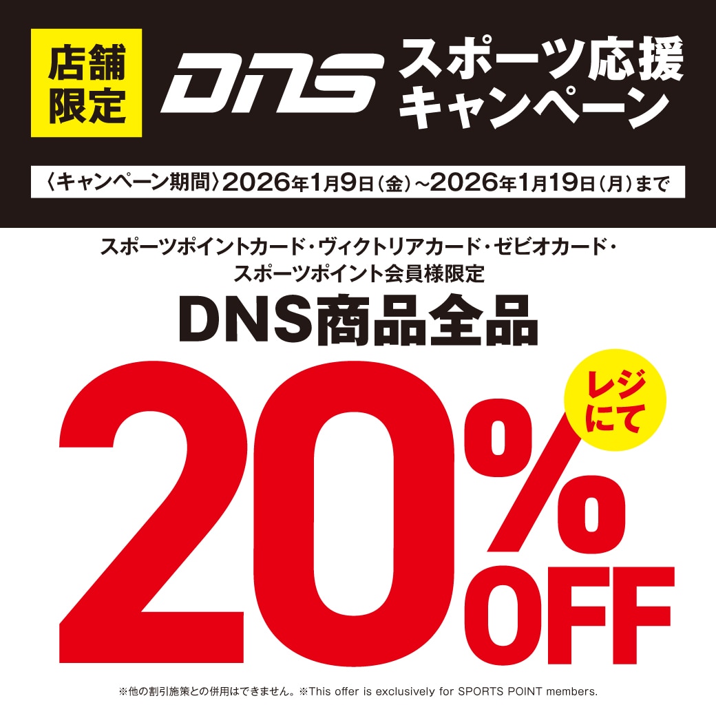 1月9日(金)~1月19日(月・祝)までの 期間中、DNS商品 をご購入でレジにて20%OFF させていただきます。 ※他の割引施策との併用はできません ※オンラインストアは対象外となります スポーツポイントカード・ヴィクトリアカード・ ゼビオカード・スポーツポイント会員様 限定の施策となります。 当日入会もOK。無料でご登録いただけます。 詳しくは店舗ナビゲーターまで お問合せください。