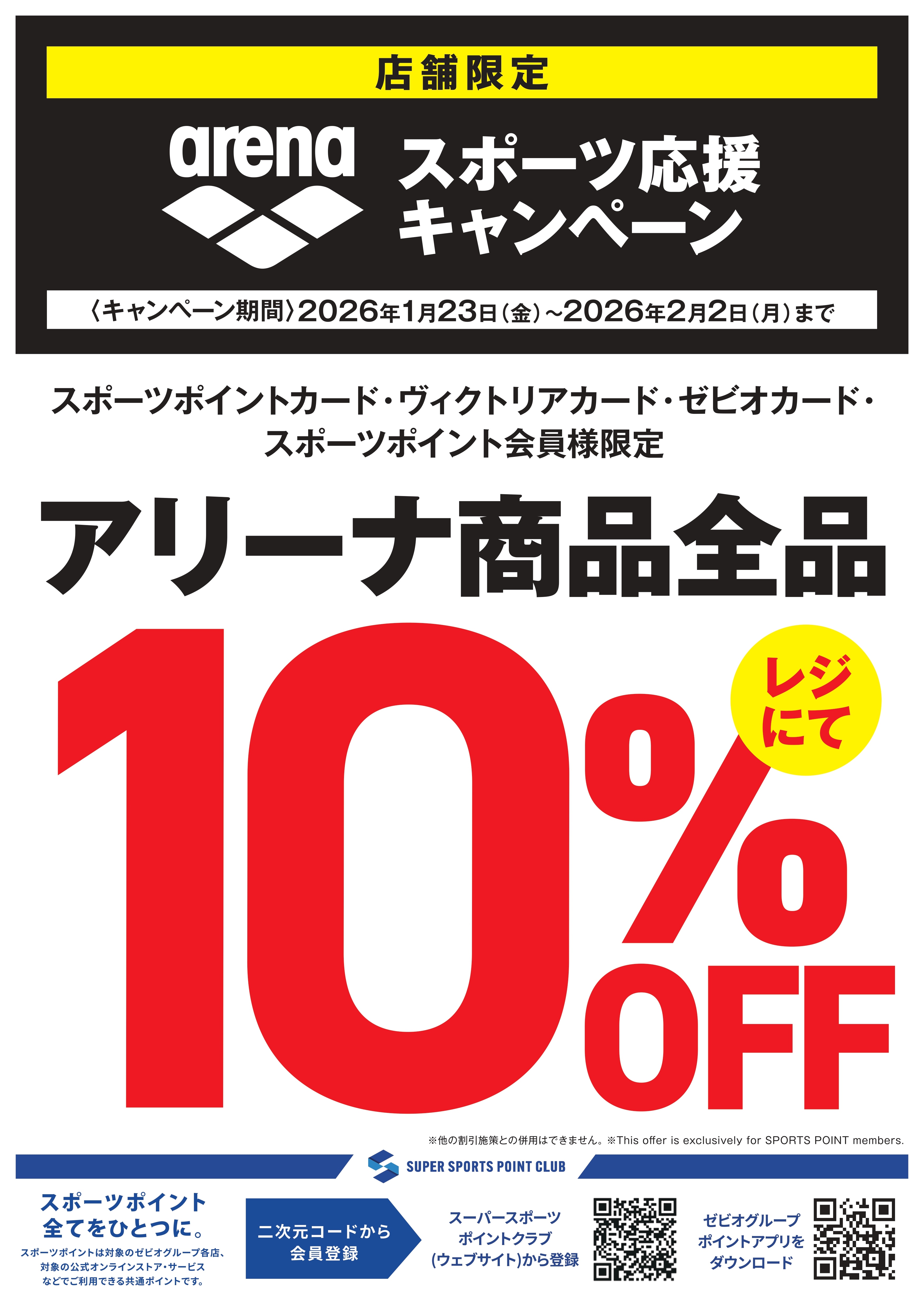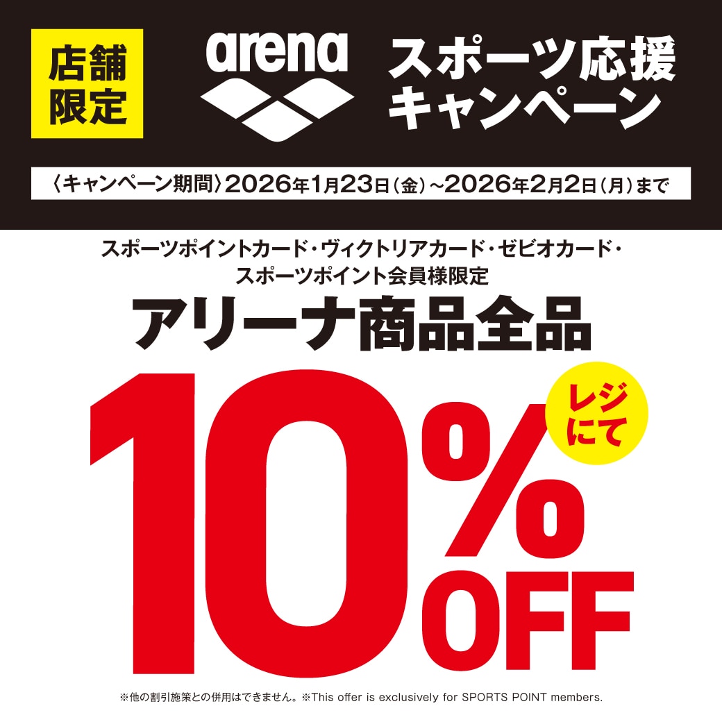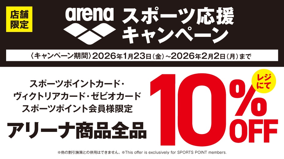 1月23日(金)~2月2日(月)までの 期間中、arena商品 をご購入でレジにて10%OFF させていただきます。 ※他の割引施策との併用はできません ※オンラインストアは対象外となります スポーツポイントカード・ヴィクトリアカード・ ゼビオカード・スポーツポイント会員様 限定の施策となります。 当日入会もOK。無料でご登録いただけます。 詳しくは店舗ナビゲーターまで お問合せください。