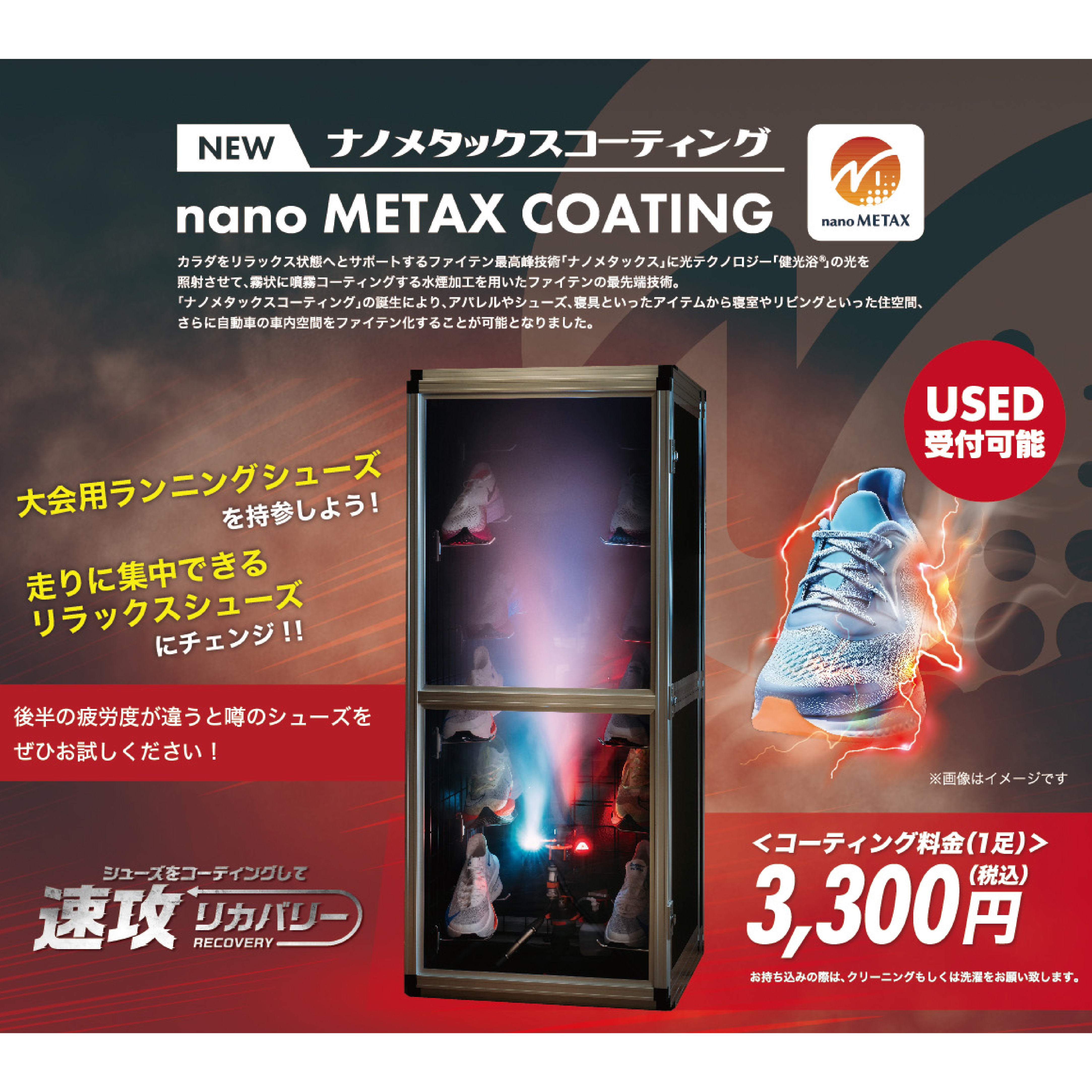 勝負シューズをさらにバージョンアップ。 ブースにシューズをお持ちください。 所要時間:15分程度 コーティング料金:3,300円(税込)