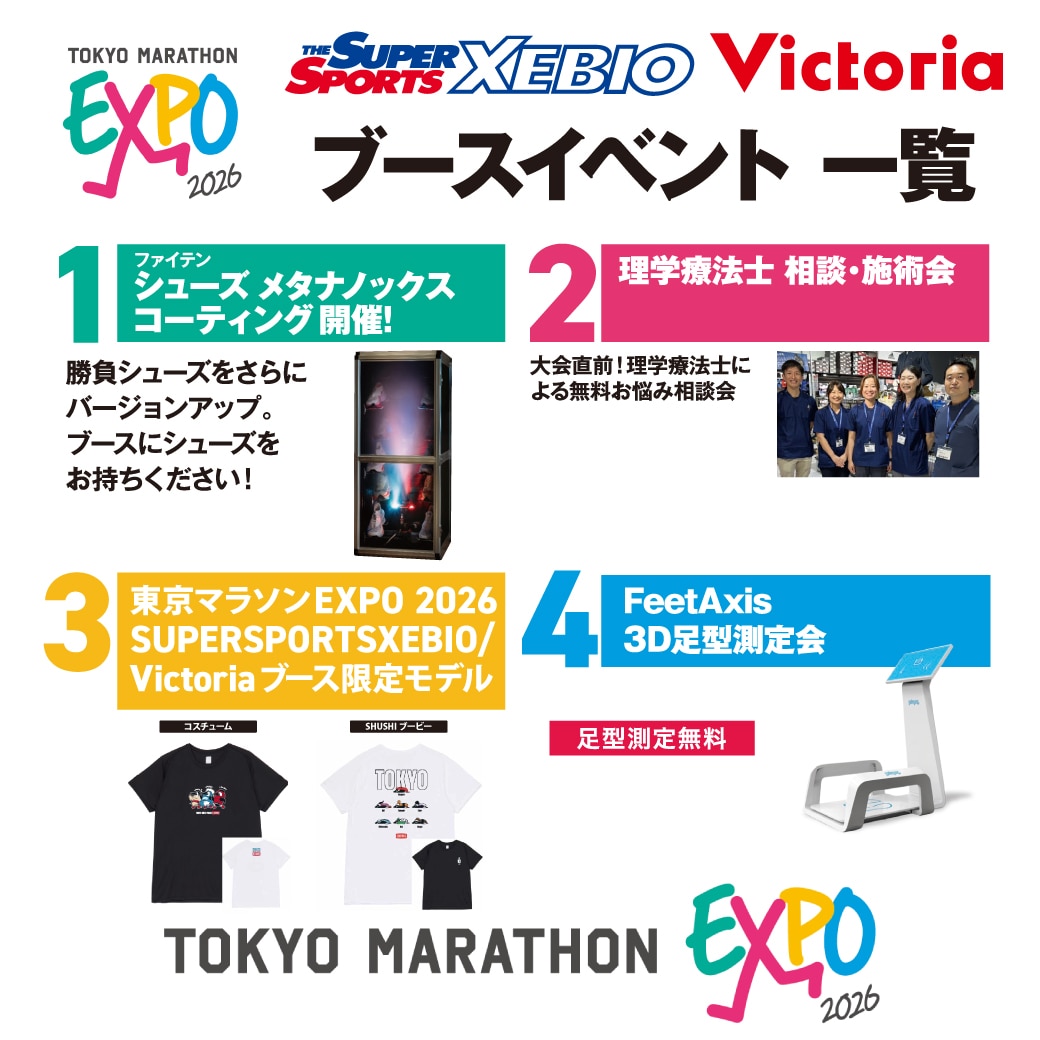 今年もSUPER SPORTS XEBIO/Victoriaが 東京マラソンEXPOに登場。 2月26日(木)~2月28日(土)までの 期間中、ブースにてイベントを開催。 場所:東京ビッグサイト 南展示棟 南3~4ホール アクセス:りんかい線 国際展示場駅より 徒歩約15分 ゆりかもめ 東京ビッグサイト駅より 徒歩約7分