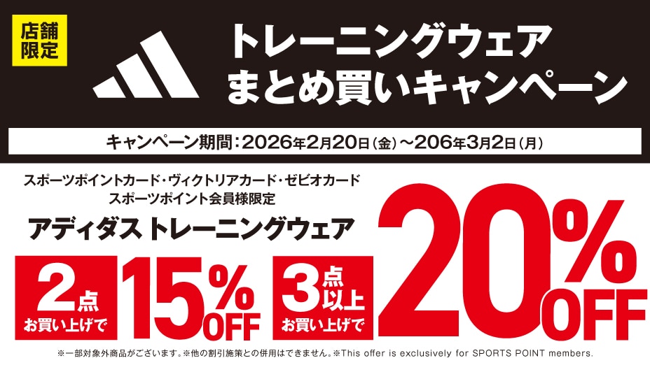 2月20日(金)~3月2日(月)までの 期間中、アディダストレーニングウェア をまとめてご購入いただくと 同時購入点数により レジにて割引させていただきます。 2点ご購入で15%OFF 3点以上ご購入で20%OFF ■対象商品 ・アパレルウェア ・スポーツウェア ※一部対象外商品がございます ※オンラインストアは対象外となります スポーツポイントカード・ヴィクトリアカード・ ゼビオカード・スポーツポイント会員様 限定の施策となります。 当日入会もOK。無料でご登録いただけます。 詳しくは店舗ナビゲーターまで お問合せください。